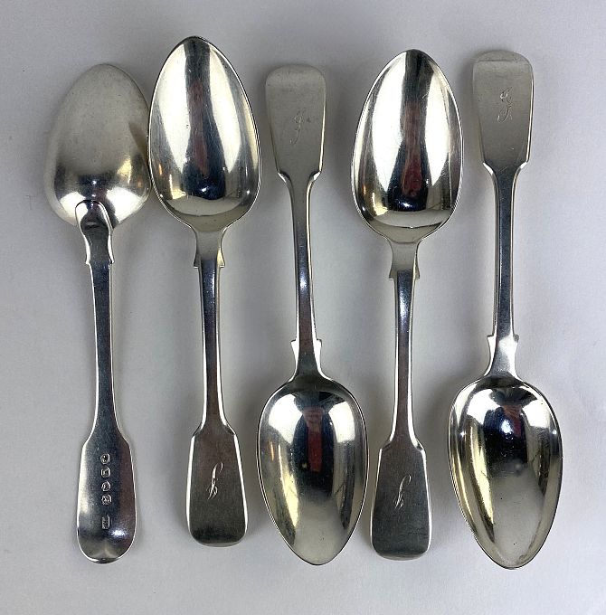 A harlequin set of five Victorian silver fiddle pattern spoons, all London, three by John & Henry Lias, four 1844, one 1847, each engraved with initial 'J' to terminal, length 17cm, total weight 7.7oz (5)