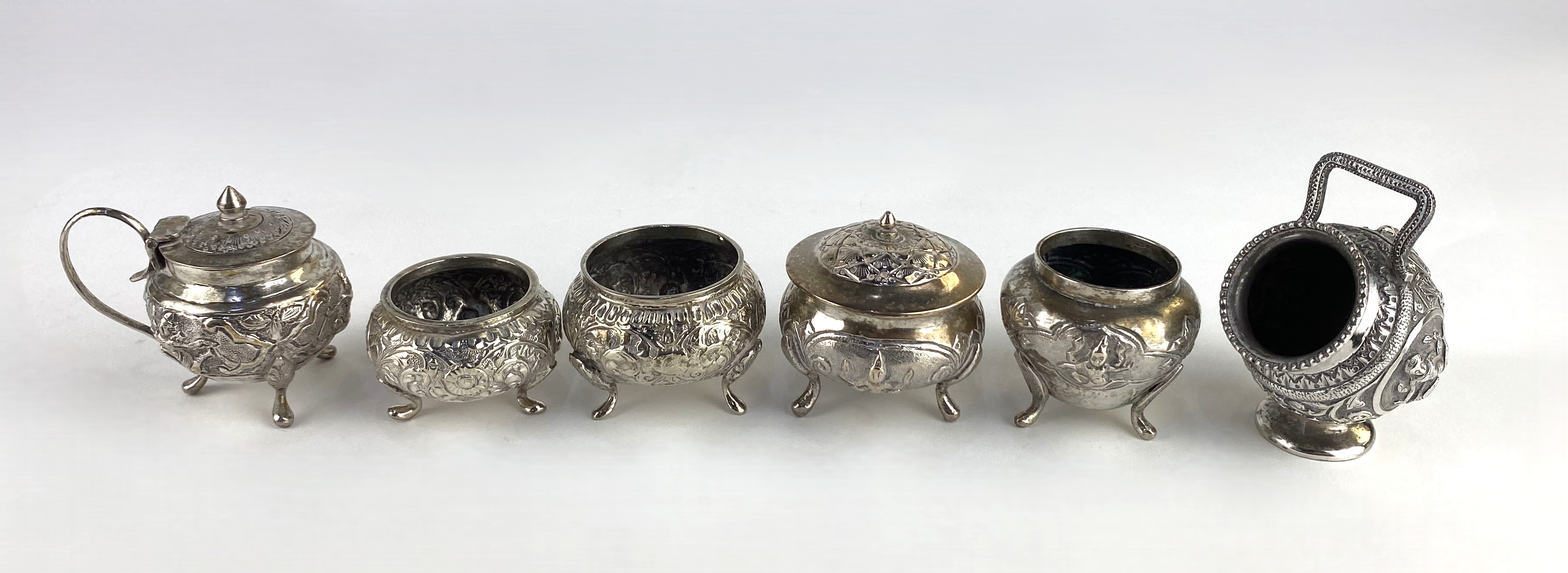A collection of six Indian/ Asian white metal condiments, each repousse decorated, including; three cauldron salts, salt pot, pepper pot, mustard pot, the largest height 6.6cm (6)