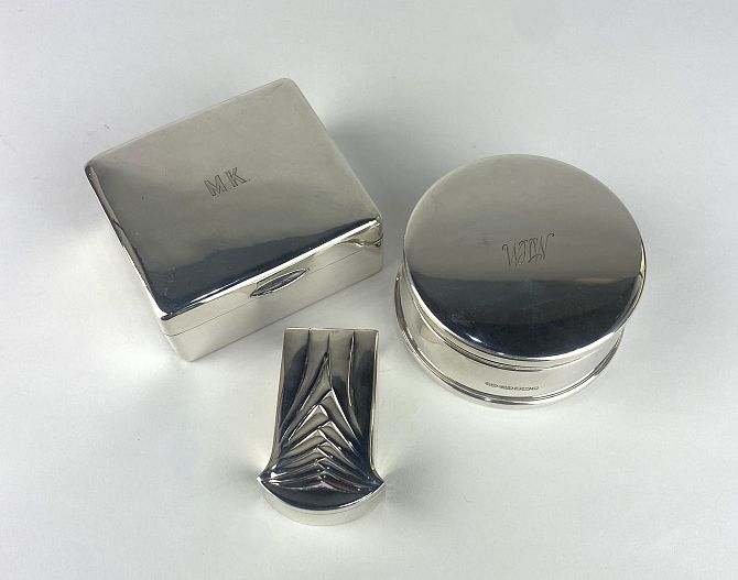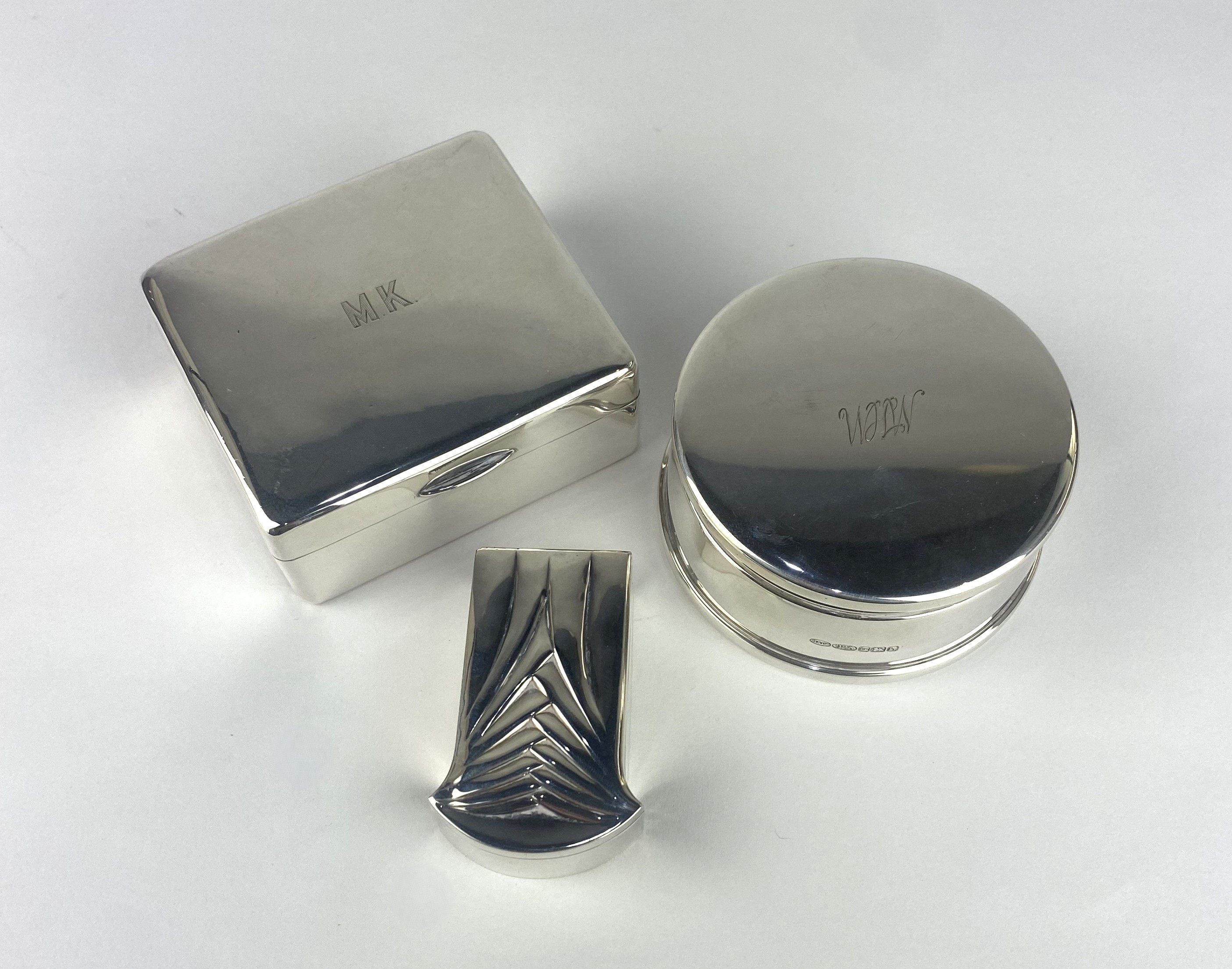 A George V silver cigarette box, makers mark worn, Birmingham, 1929, monogram engraved to lid, width 8.5cm, together with an Elizabeth II small silver dressing table box, with stylised lid, London, 1976, and an Elizabeth II silver trinket box, of round form, Birmingham, 2007, monogram engraved to lid, diameter 8.5cm (3)