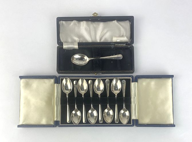 A Elizabeth II cased set eight silver coffee spoons, by Turner & Simpson Ltd., Birmingham, 1964, together with a cased silver teaspoon, Birmingham, 1941, total gross weight 2.6oz