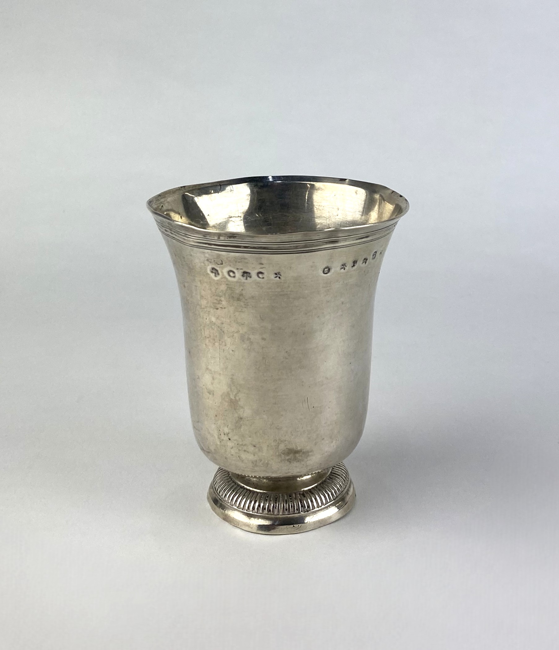 A French white metal beaker, late 18th/ early 19th century, bearing French silver marks, variously initialled to body, flared body reeded rim, circular fluted foot (AF) height 10cm, 3.3oz (4)