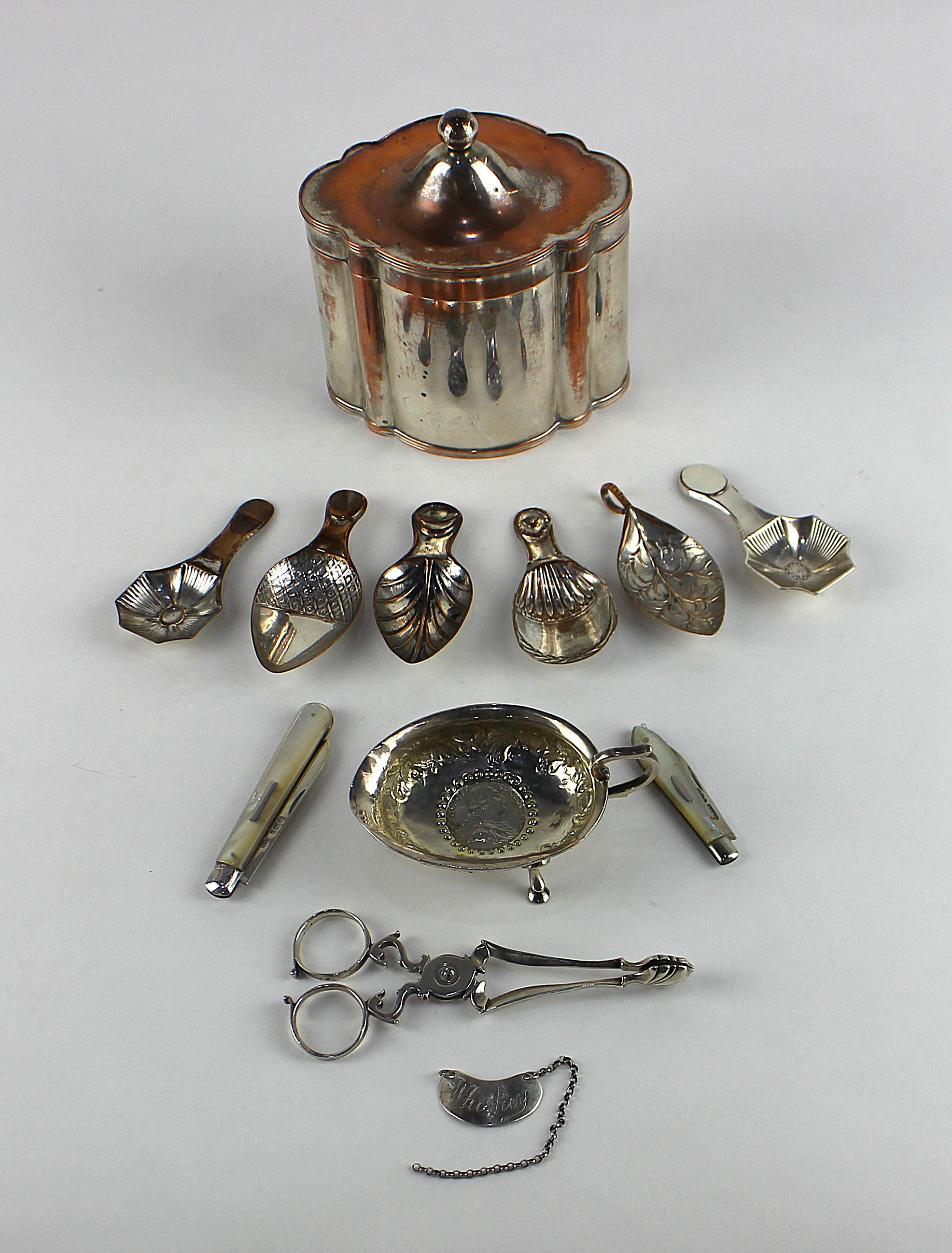 A George III coin set sauce boat, possibly converted from a pap boat (AF), length 9.2cm, together with two mother of pearl handled silver bladed fruit knives, a pair of Georgian silver sugar nips, with shell cast bowls, marks worn, an Edwardian silver whiskey decanter label, by Charles & George Asprey, London, 1904 (AF) and a silver plated tea caddy with six silver plated caddy spoons (all AF) (qty)