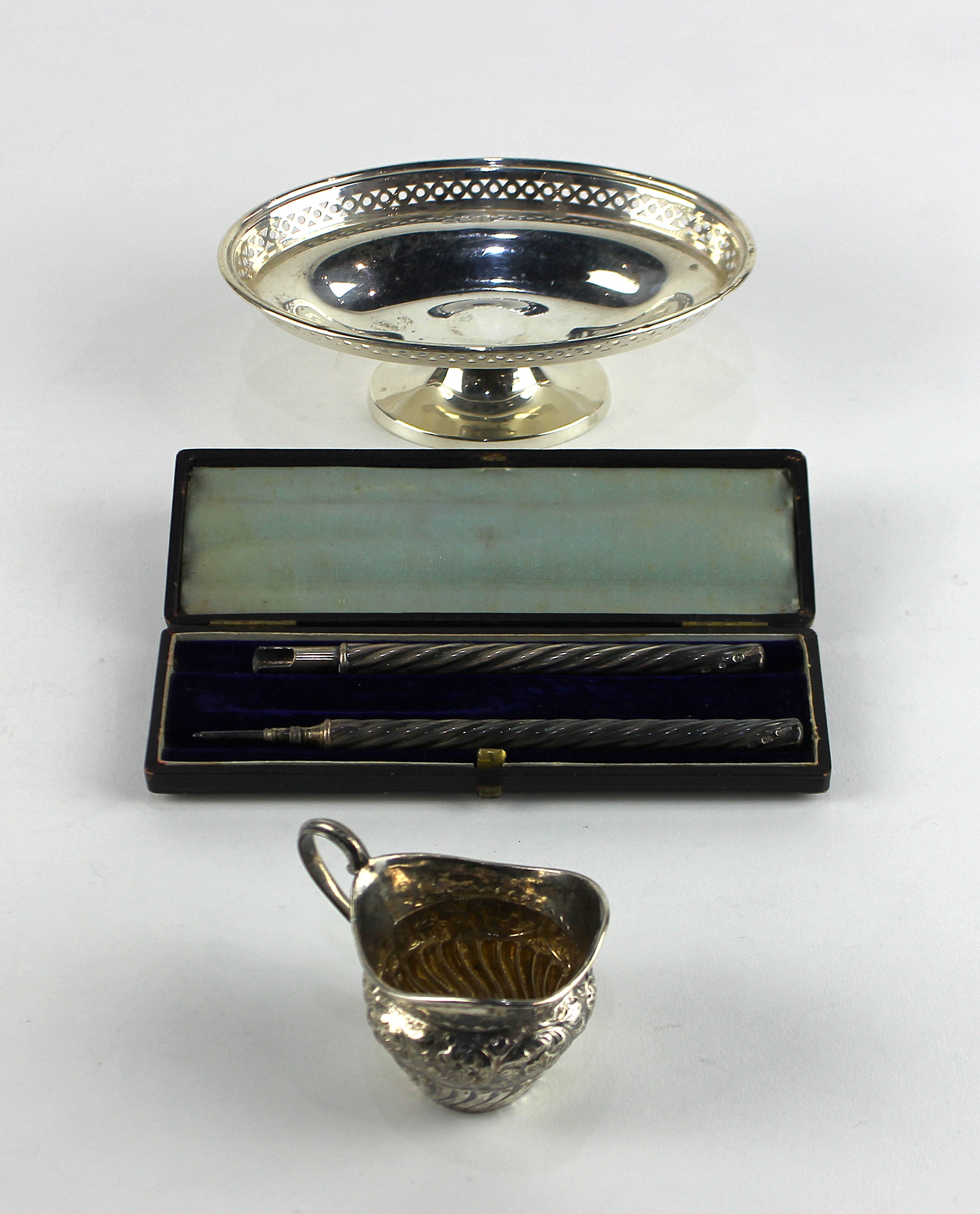 A George V silver footed bon bon dish, makers mark worn possibly by Henry Clifford Davis, Birmingham, 1922, width 15.2cm, together with a 19th century cream jug, marks worn, with gadrooned body and floral embossed band, height 5cm (AF), and a late Victorian cased part silver writing set, of wrythen form including dip pen and propelling pencil, by Villiers & Jackson, Birmingham, 1892, total gross weight 4.6oz (3)