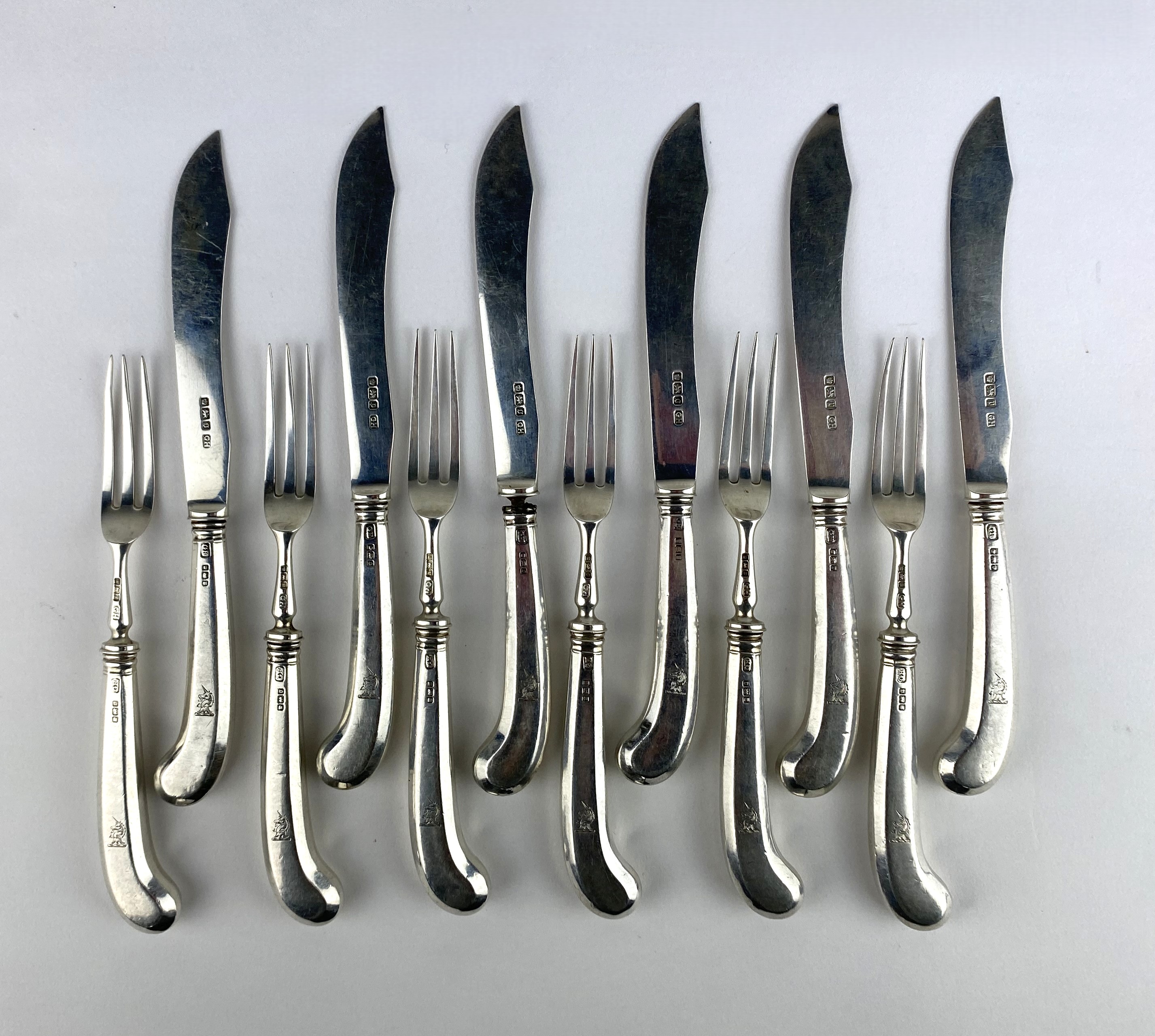 A set of six Edwardian silver fruit knives and forks with pistol grip handles, hallmarked handles and blades, Sheffield1906/07/08, total weight 15.60 ozs, (12).