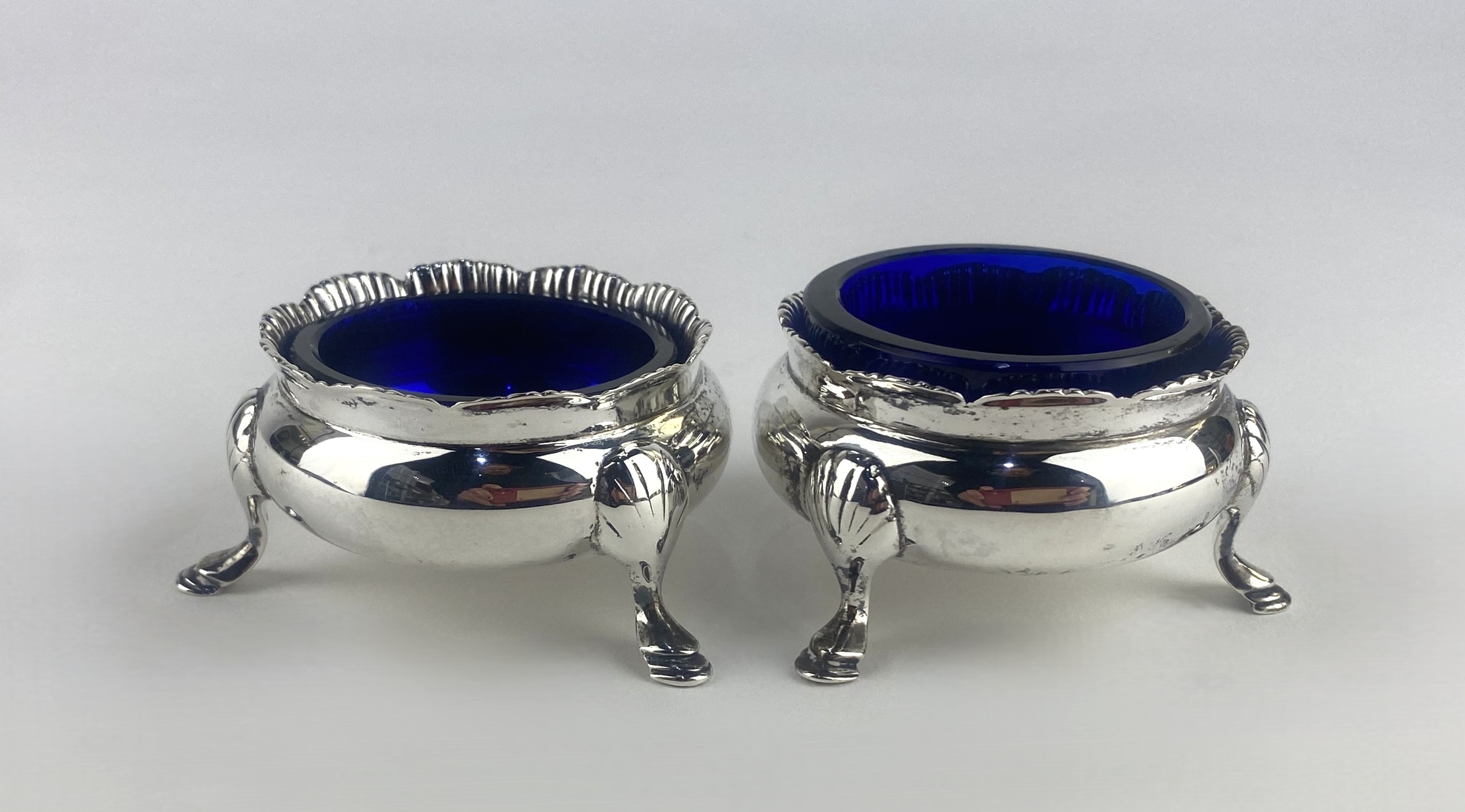 A pair of George III style silver salts, by Stokes & Ireland Ltd., Chester, 1918 and 1919, with blue glass liners gadrooned rims, each raised on three hooofed feet, height 3.3cm, 3.1oz