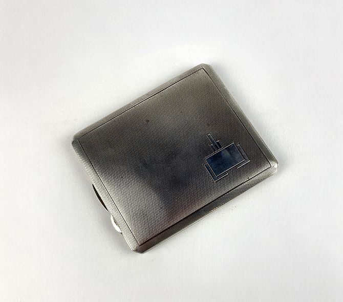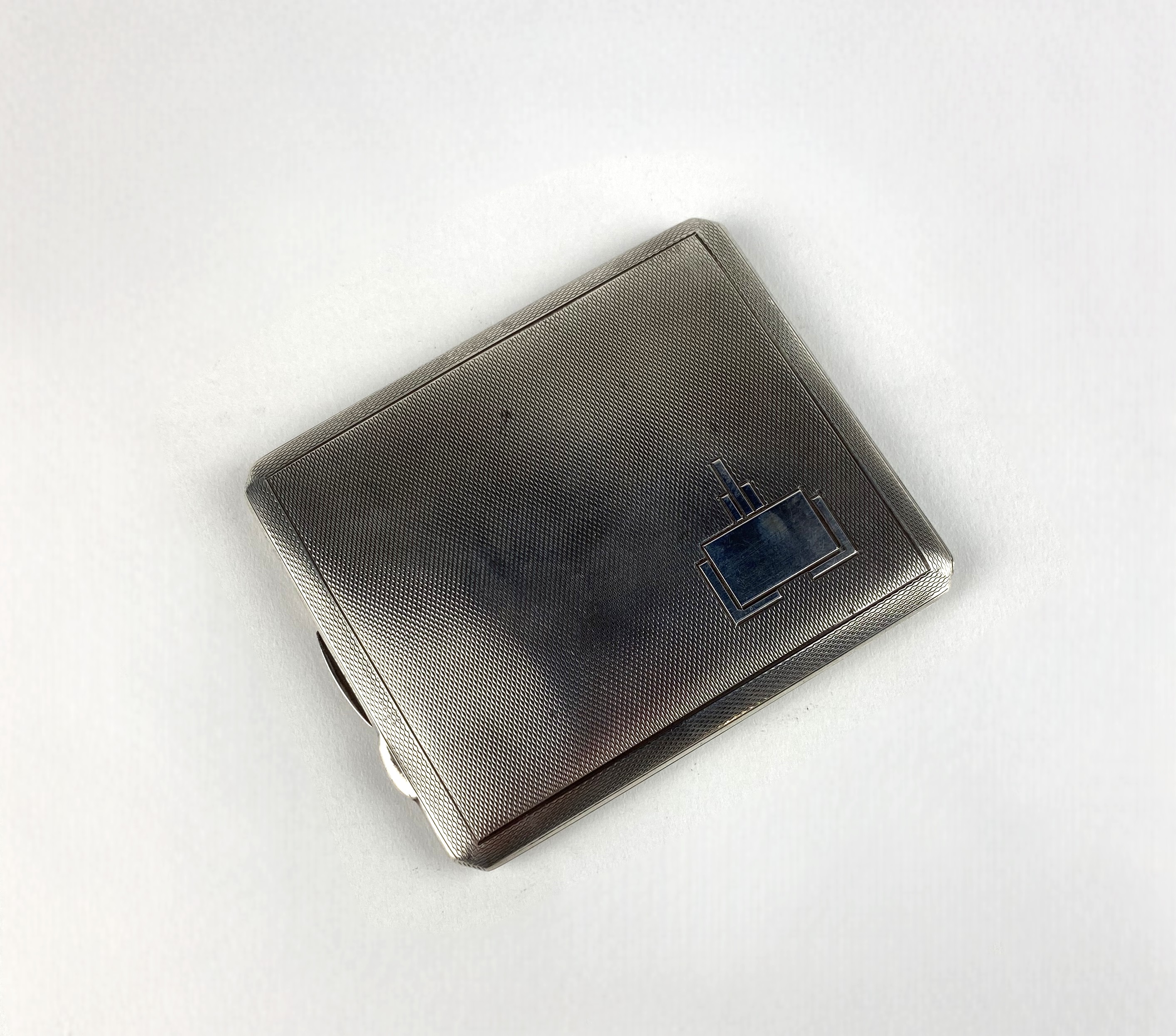 A George V Art Deco silver cigarette case, maker Bravingtons Ltd., Birmingham 1936, of cut cornered rectangular form with engine turned decoration and vacant cartouche, silver gilt interior, 10cm by 8.5cm, 4.2oz