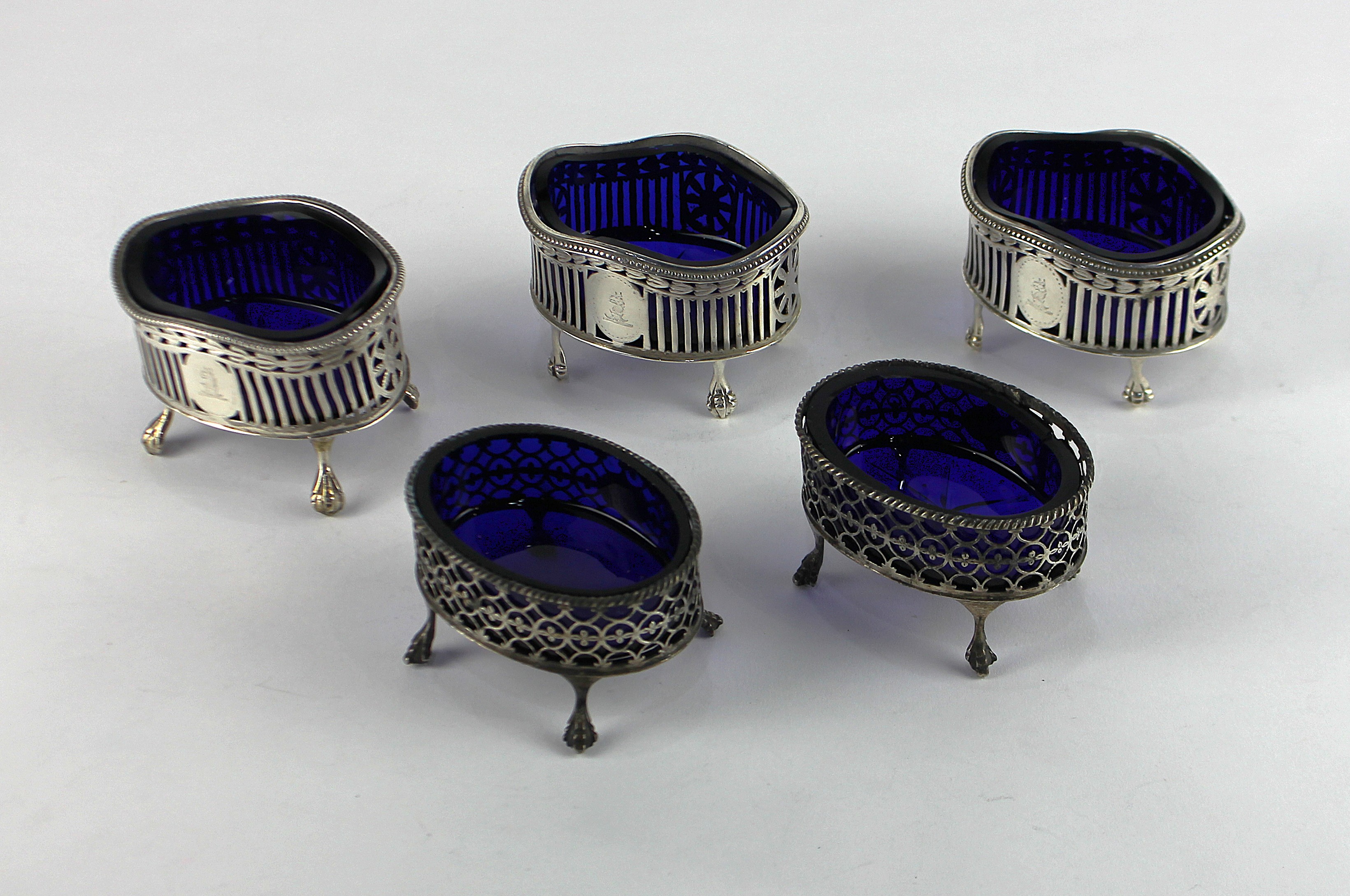 A pair of George III silver table salts, Sheffield, 1780, of oval form, with beaded borders, pierced decoration, each engraved with a griffins head, raised on four ball and claw feet, with blue glass liners, together with a similar salt cellar, London, 1790, with blue glass liner, 8cm wide, and a matched pair of George III silver salts, London, one 1772, makers marks rubbed, pierced decoration, monogrammed to cartouche, each raised on four claw feet, with blue glass liners (one liner AF) , width 7.75cm, silver weight 5.8oz (5)
