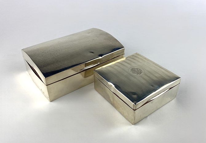 Two silver mounted cedarwood lined cigarette boxes, early / mid 20th century, marks rubbed, 13.5cm wide and 9cm wide, (2).