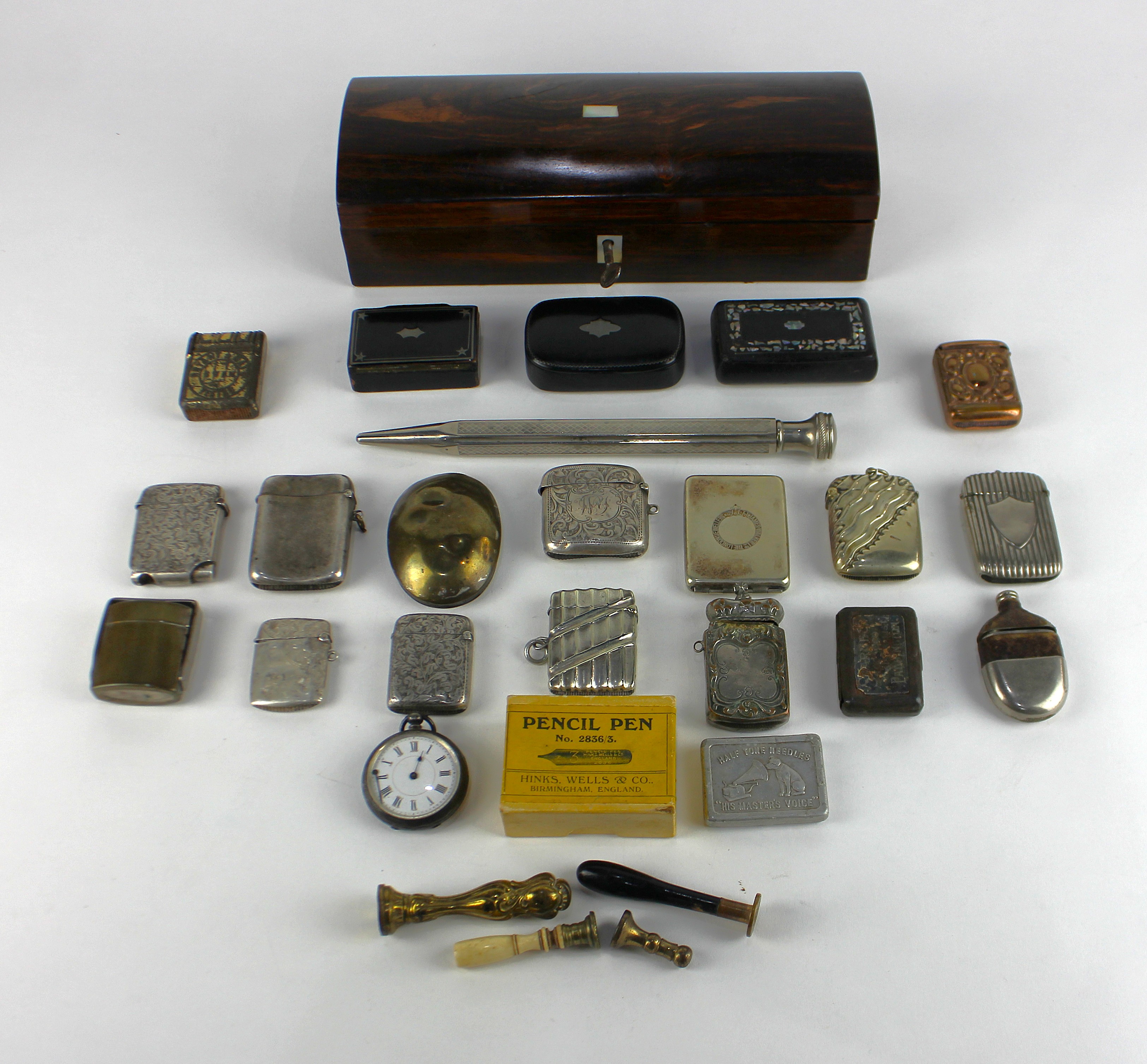 An Edwardian silver vesta case, by Joseph Gloster, Birmingham, 1905, together with four further silver vesta cases, Victorian and Edwardian, all Birmingham, total weight 4oz, a Victorian silver cased pocket watch, Birmingham, 1883, a vintage rosewood domed topped box, with mother of pearl inlay and escutcheon, a novelty vesta in the form of a miniature flask, eight further metal vesta cases, a brass travelling ink well, four wax seals one with bone handle, a HMV needle case, three 19th century papier-mache snuff boxes, a brass snuff box, a large white metal propelling pencil, marked Foreign, together with a box of pen nibs, by Hinks, Wells & Co. (qty)