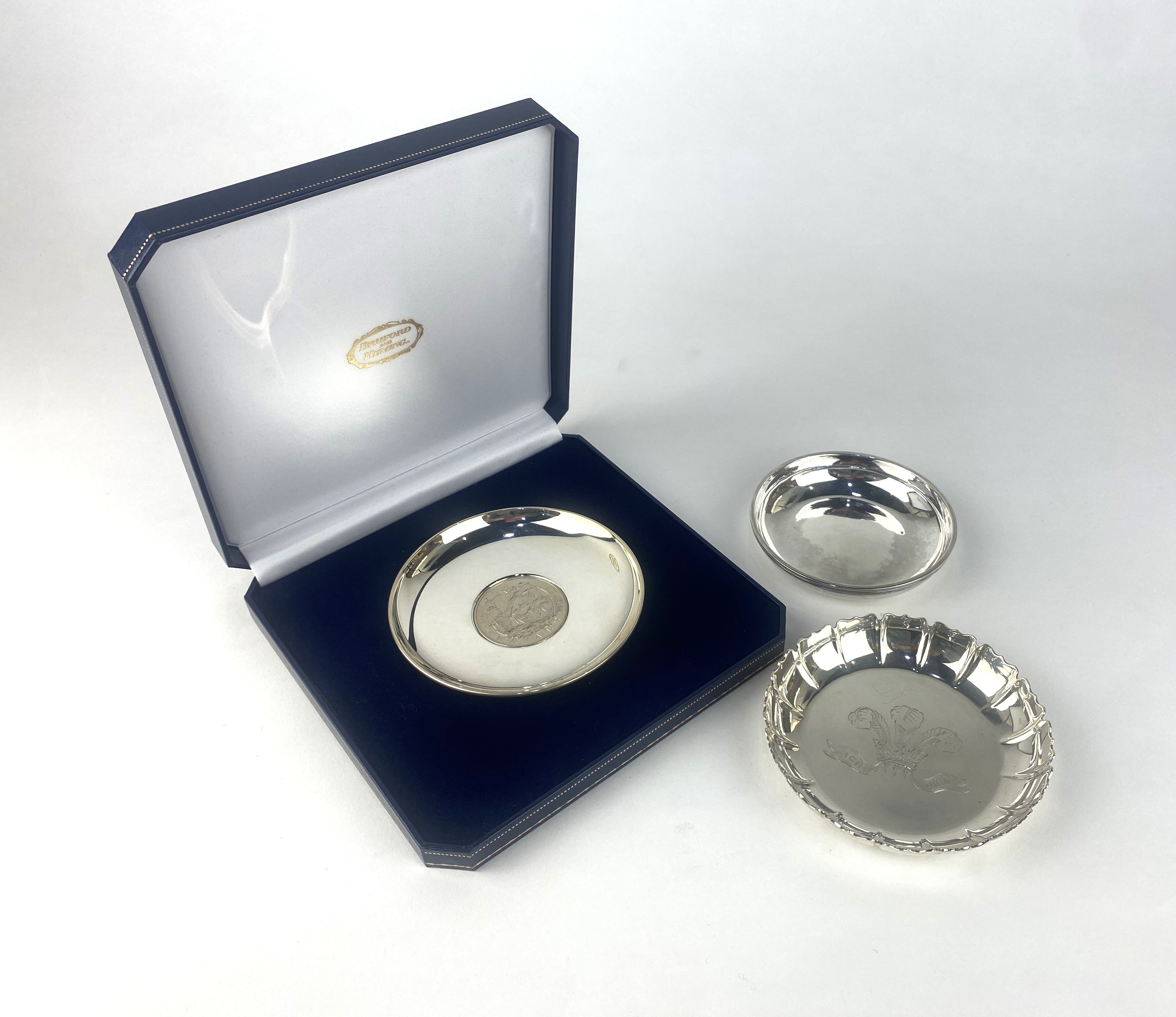 A George V silver circular pin dish, by the Guild of Handicraft, London, 1934 (Jubilee hallmark), with reeded rim, of plain form, diameter 9.1cm, together with a Royal Wedding commemorative silver dish, by Tessiers Ltd., London, 1981, with shaped rim, centrally engraved with the Prince of Wales feathers, engraved to base 'The Prince of Wales * Lady Diana Spencer 29th July 1981', diameter 10.5cm, and an Elizabeth II cased commemorative Trafalgar bicentenary silver dish, 1805 - 2005, inset with a silver £5 coin, diameter 10.2cm, gross total weight 8.9oz (3)