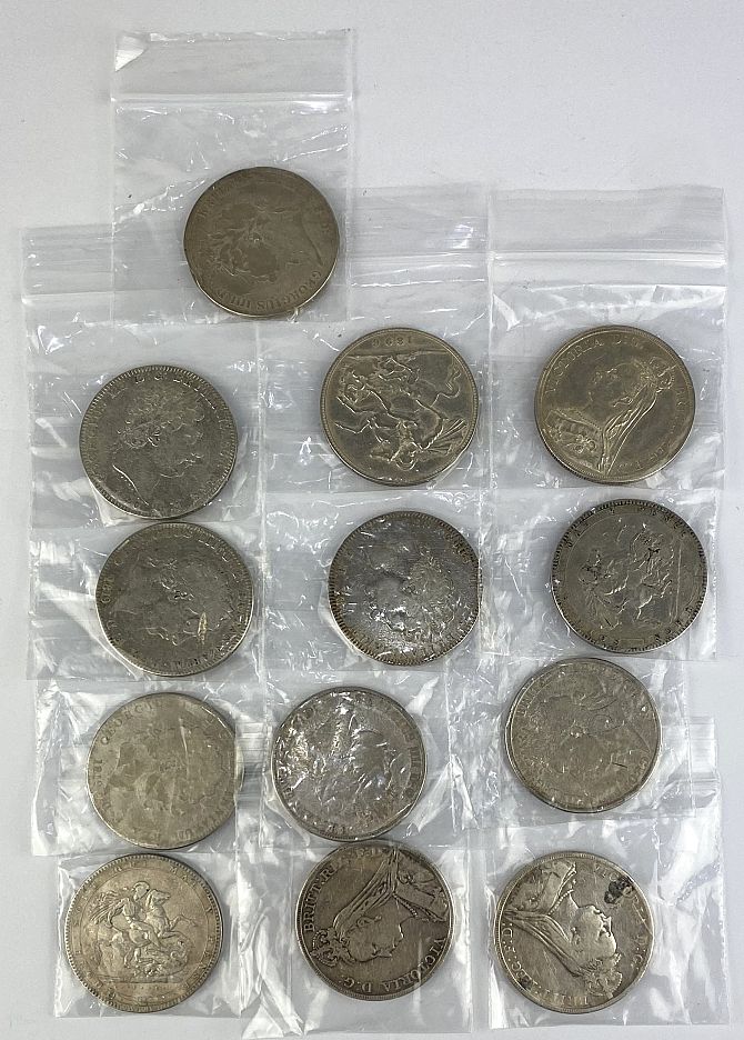A group of thirteen silver crowns comprising six George III, three George IV, three Victoria Jubilee Head and one Old Head 1896