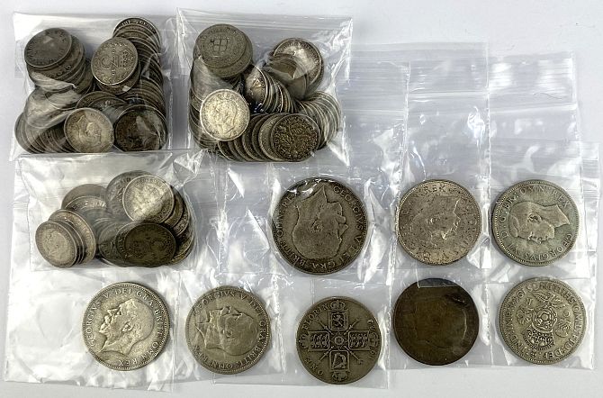 A group of pre-decimal pre-1947 silver coinage including one half crown, seven florins, various six pences and three pences