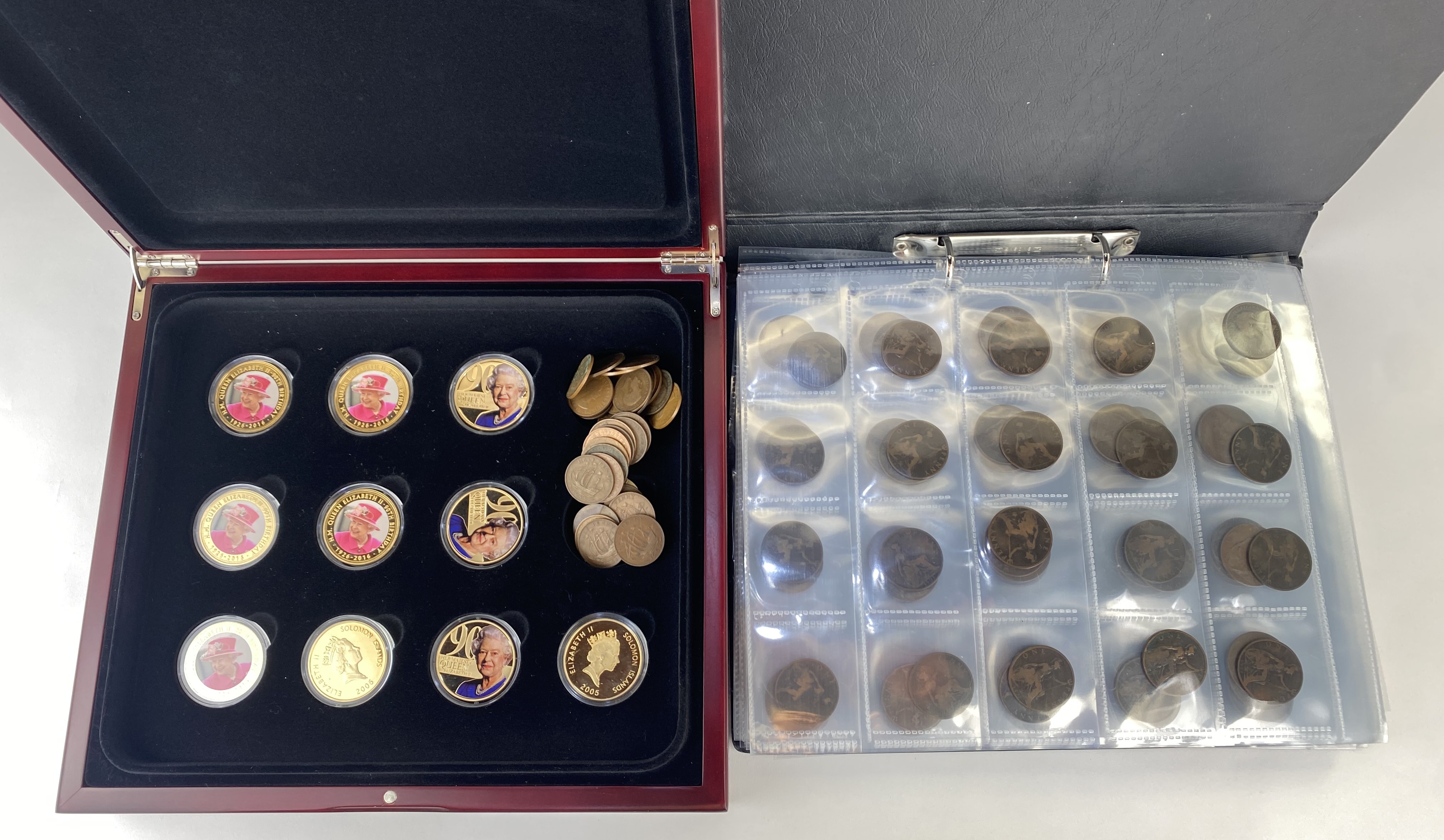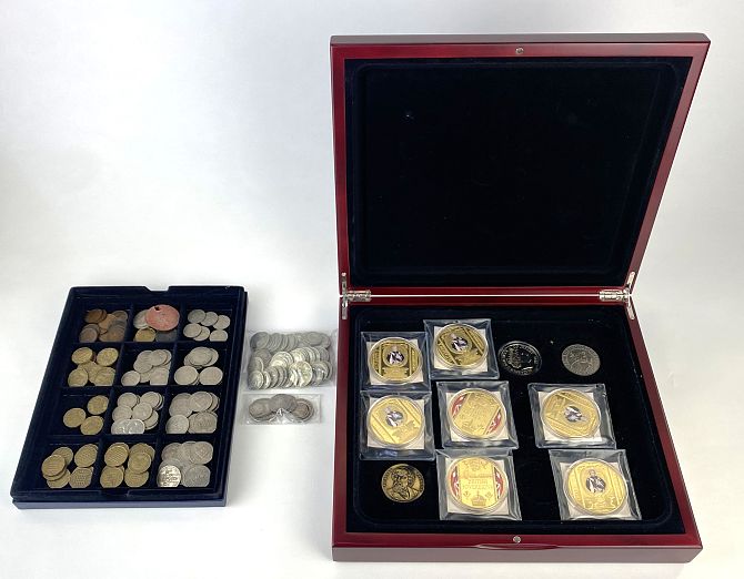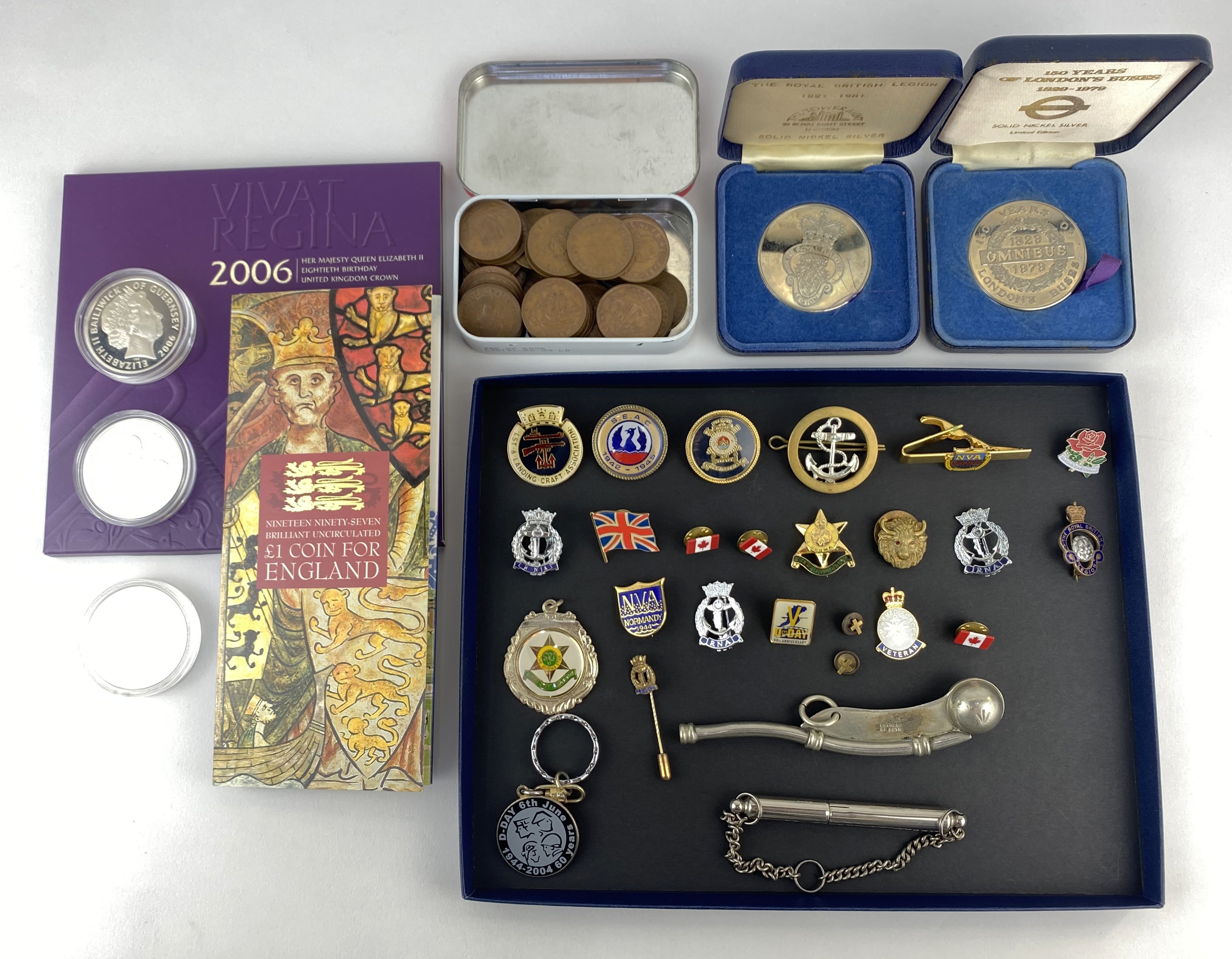 A group of mostly British coins to include pre-1947 issues, 282g, an 1894 Florin and further pre-1920 issues, weight 46g, further coins, badges and a Boatswain's whistle