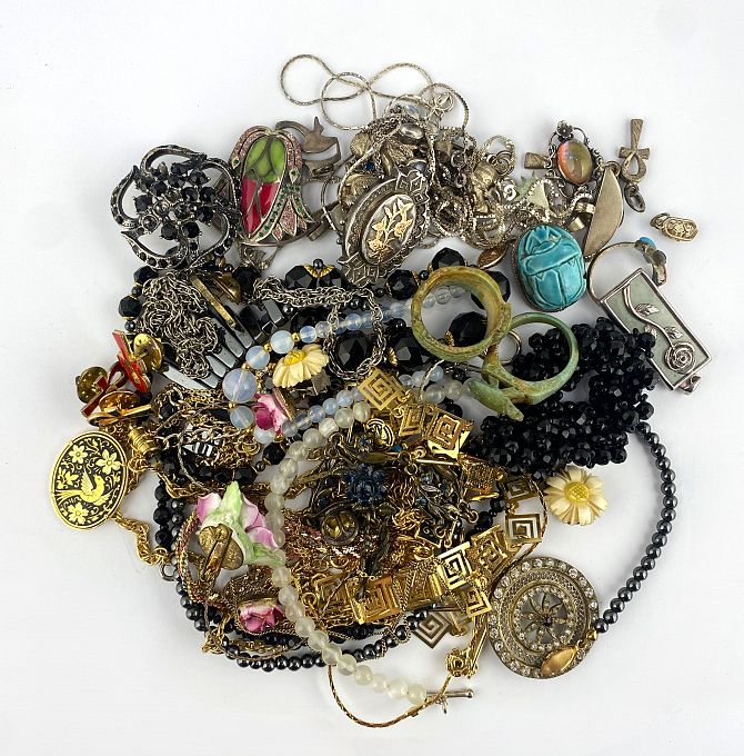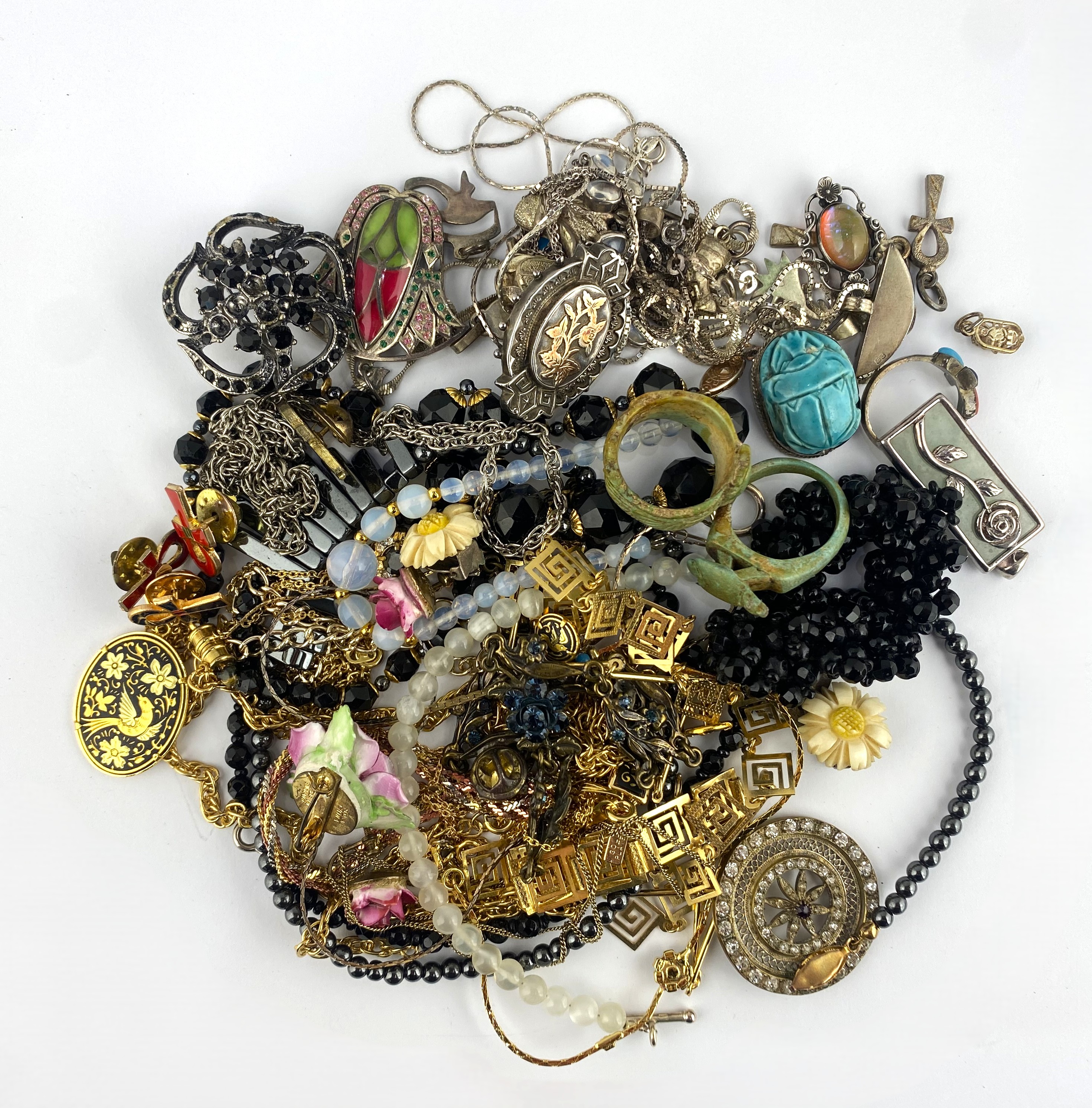 A group of silver and costume jewellery, including some of Egyptian-inspired design.