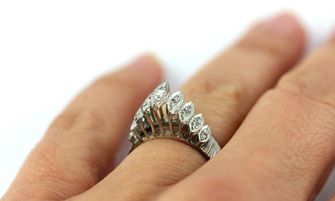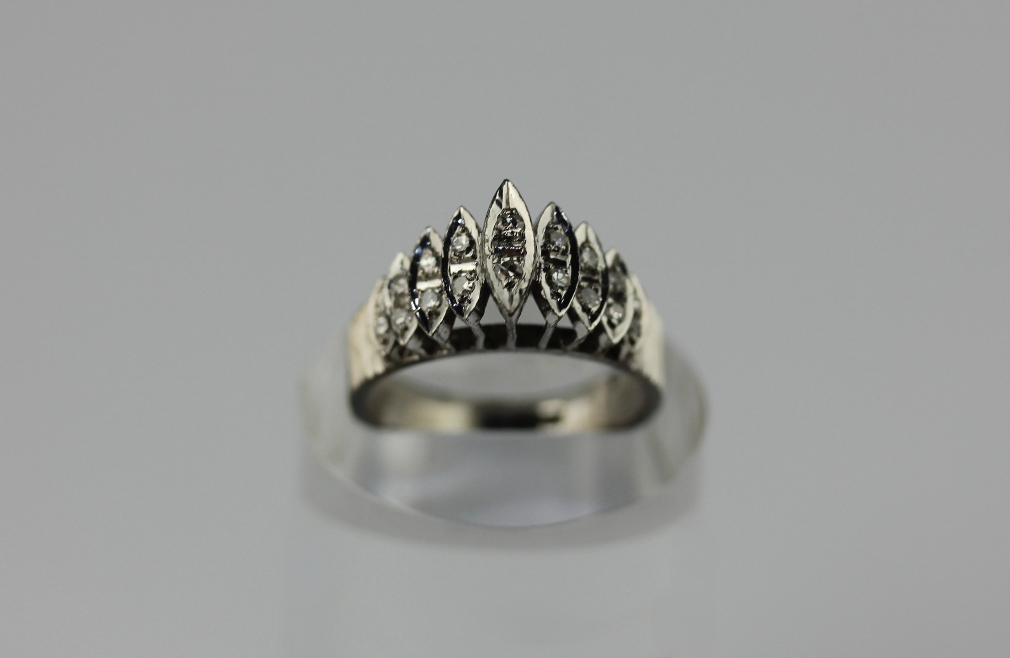 A white gold and diamond ring mounted with circular cut diamonds within nine boat shaped settings, detailed '18k', ring size M, gross weight 4.6g
