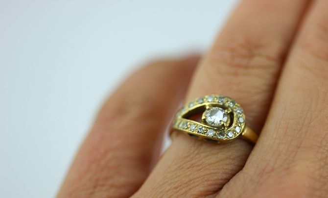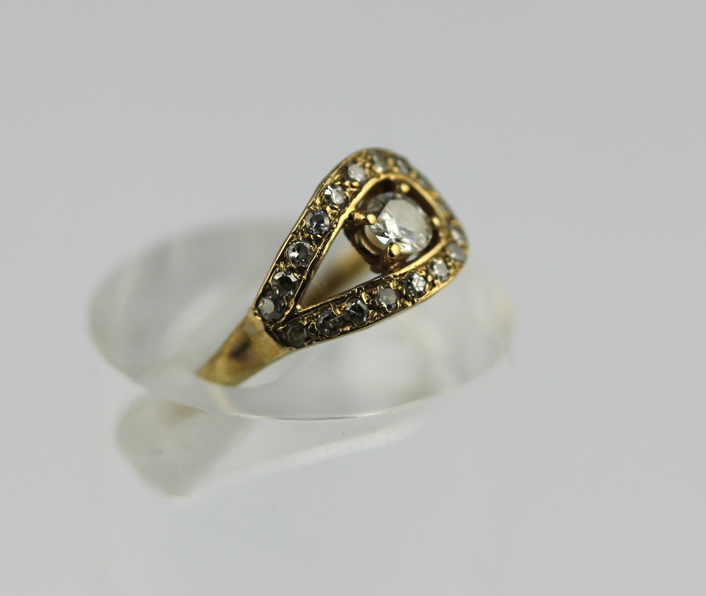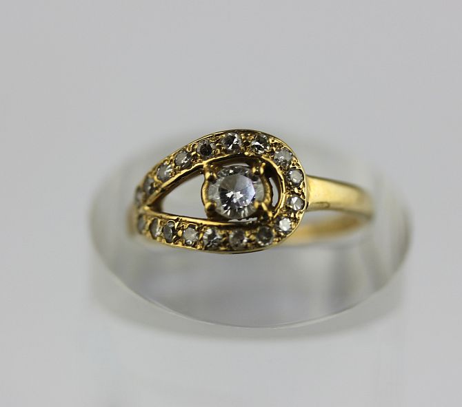 A 9 carat gold and diamond ring, in a loop form design, claw set with the principal circular cut diamond at the centre, otherwise set with single cut diamonds, ring size L, gross weight 2.2g, with a case.