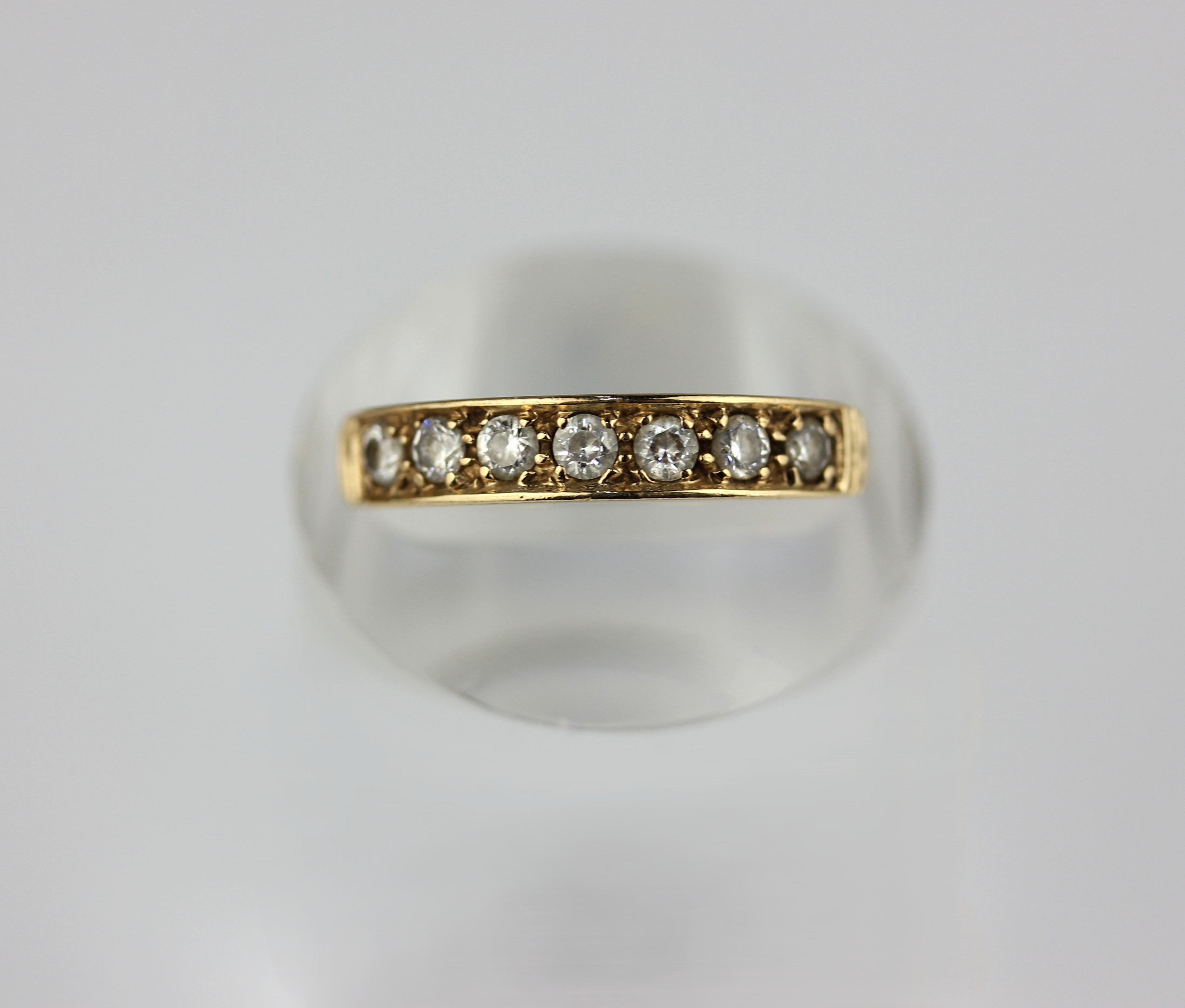 A 9ct gold and gem set seven stone half hoop ring, size O, gross weight 2.2g