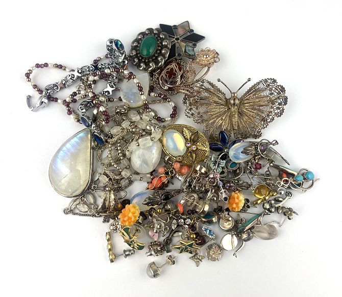 A group of silver and costume jewellery, including three moonstone pendants, a filigree butterfly brooch and various pairs of earrings