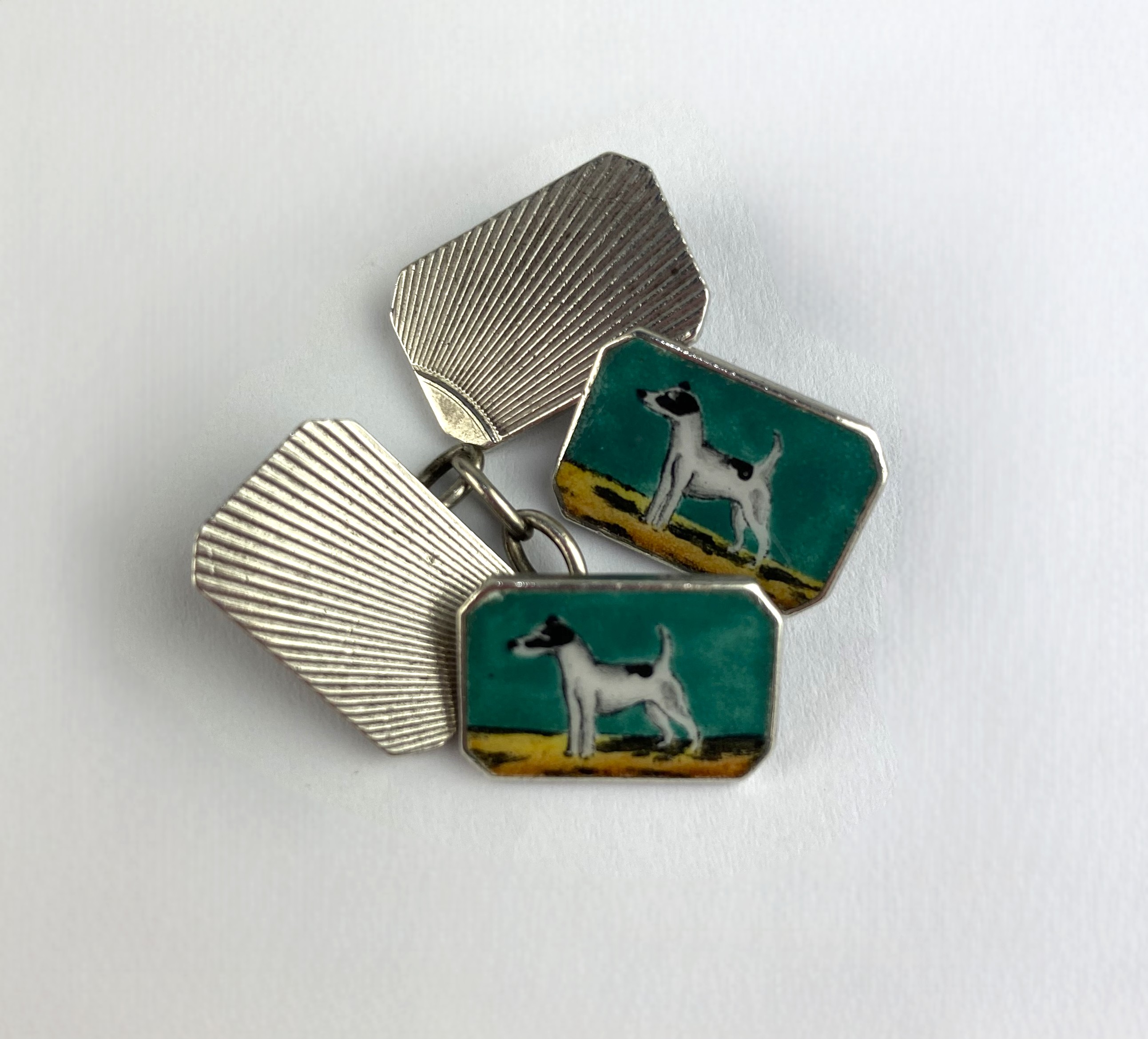 A pair of silver and enamelled cut cornered rectangular cufflinks with dog motifs, gross weight 8.1g, with a case