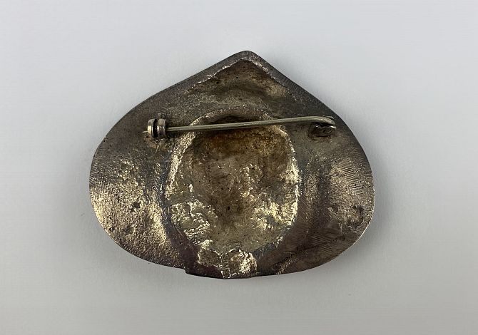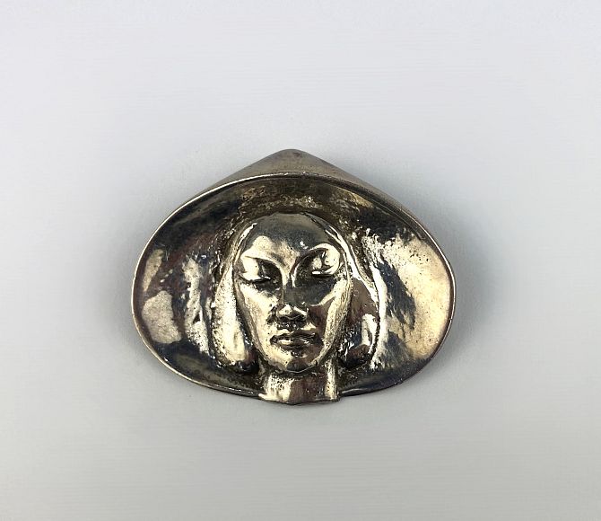A silver brooch designed as the head of a woman wearing a hat, detailed 'SILVER', 36.6g