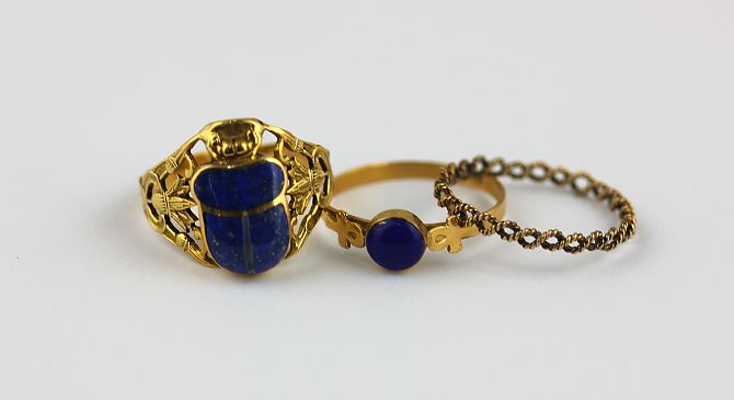 Three rings, comprising an Egyptian gold and lapis lazuli scarab ring, a gold and lapis lazuli bead ring and another ring