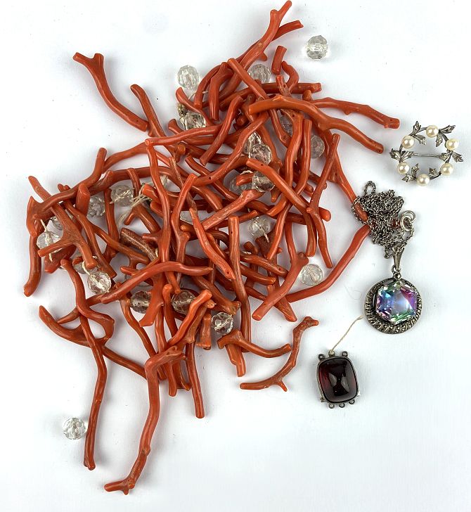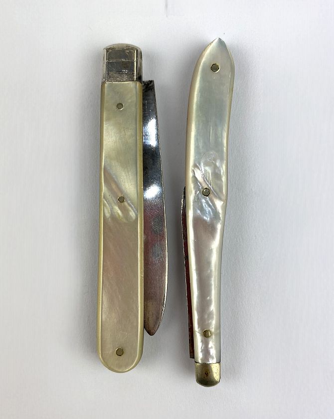 A cultured pearl wreath brooch, a silver marcasite and pearl pendant with a neckchain, a silver blade mother of pearl folding fruit knife, Sheffield 1903, a mother of pearl pen knife and other items