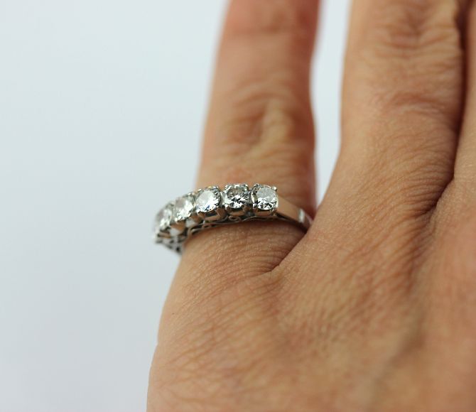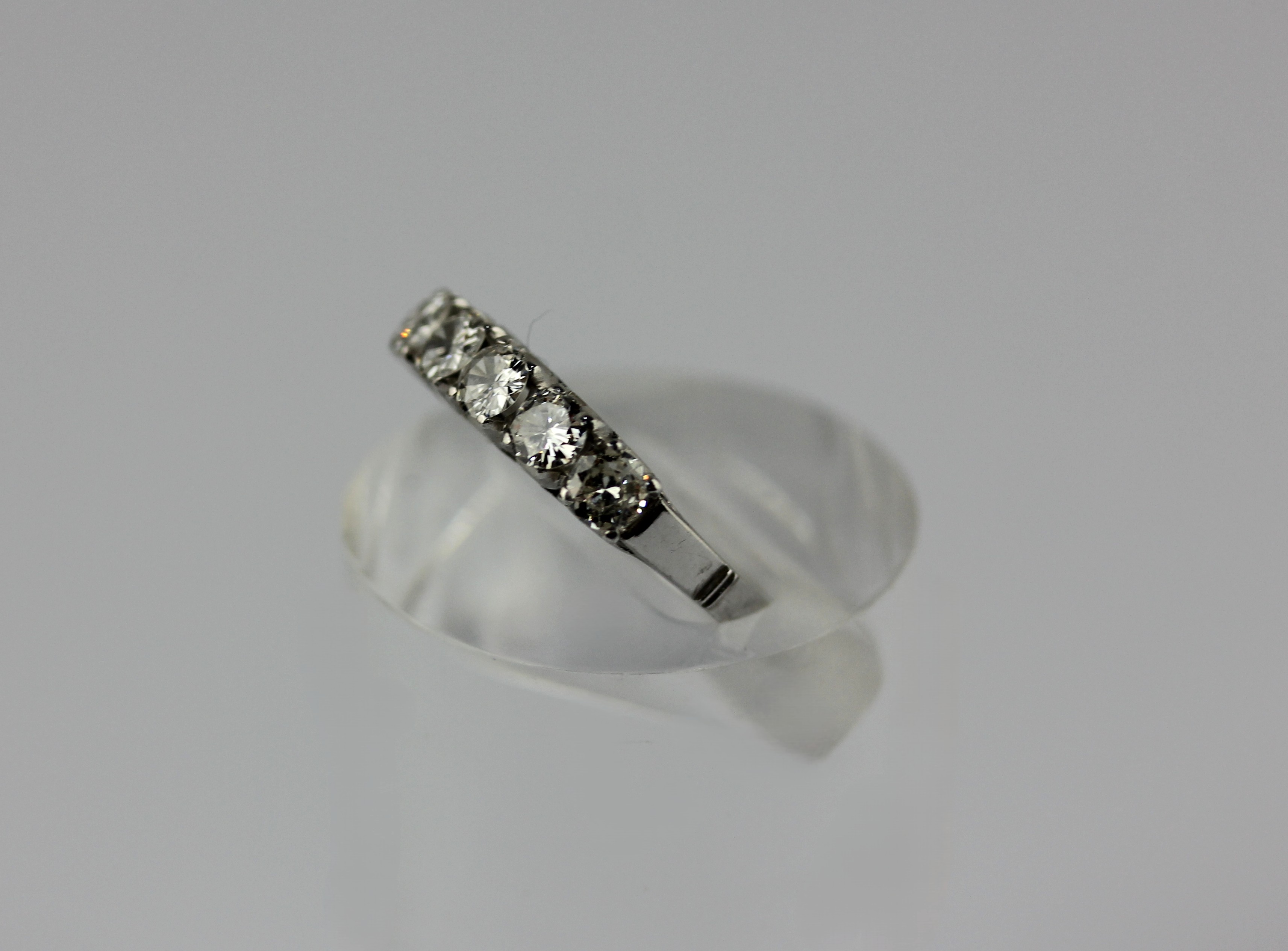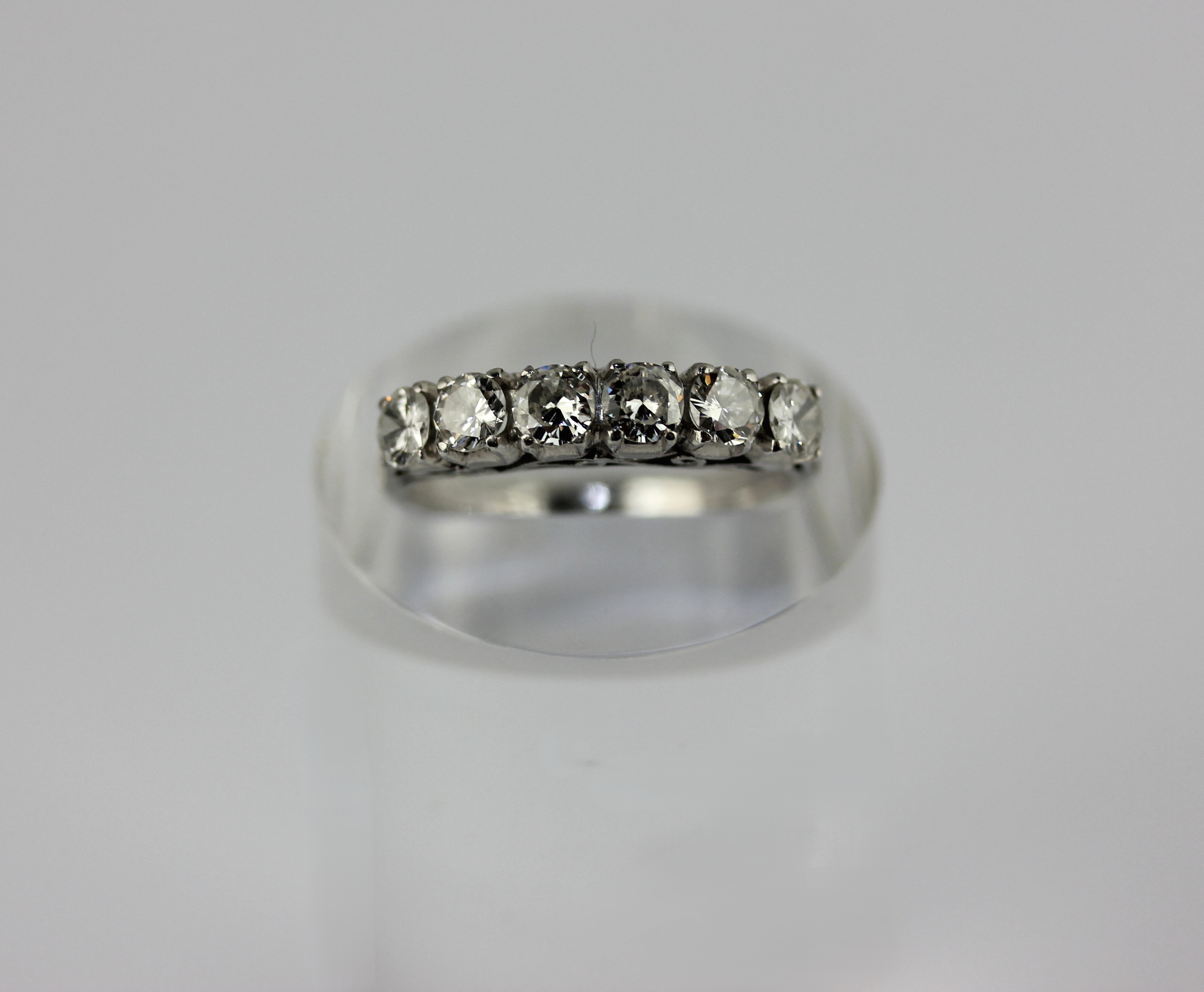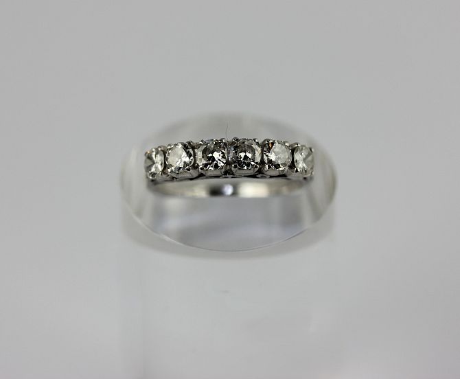 A diamond six stone ring, claw set with a row of six circular cut diamonds, indistinct Asian mark, ring size J, 3.3g