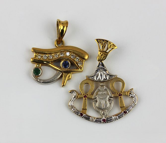 Two gold pendants, comprising an Egyptian gold diamond and ruby pendant and an Egyptian gold diamond sapphire and emerald pendant, gross weight 8.7g