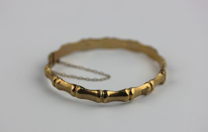 A 9ct gold oval hinged bangle, in a hollow bamboo form design, fitted with a safety chain, gross weight 7.8g