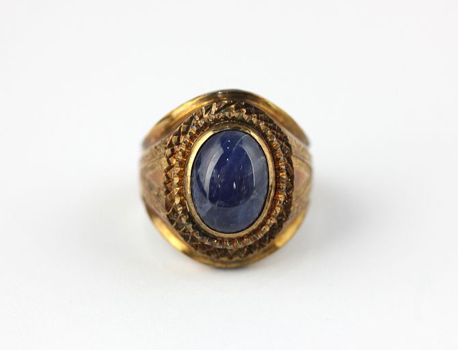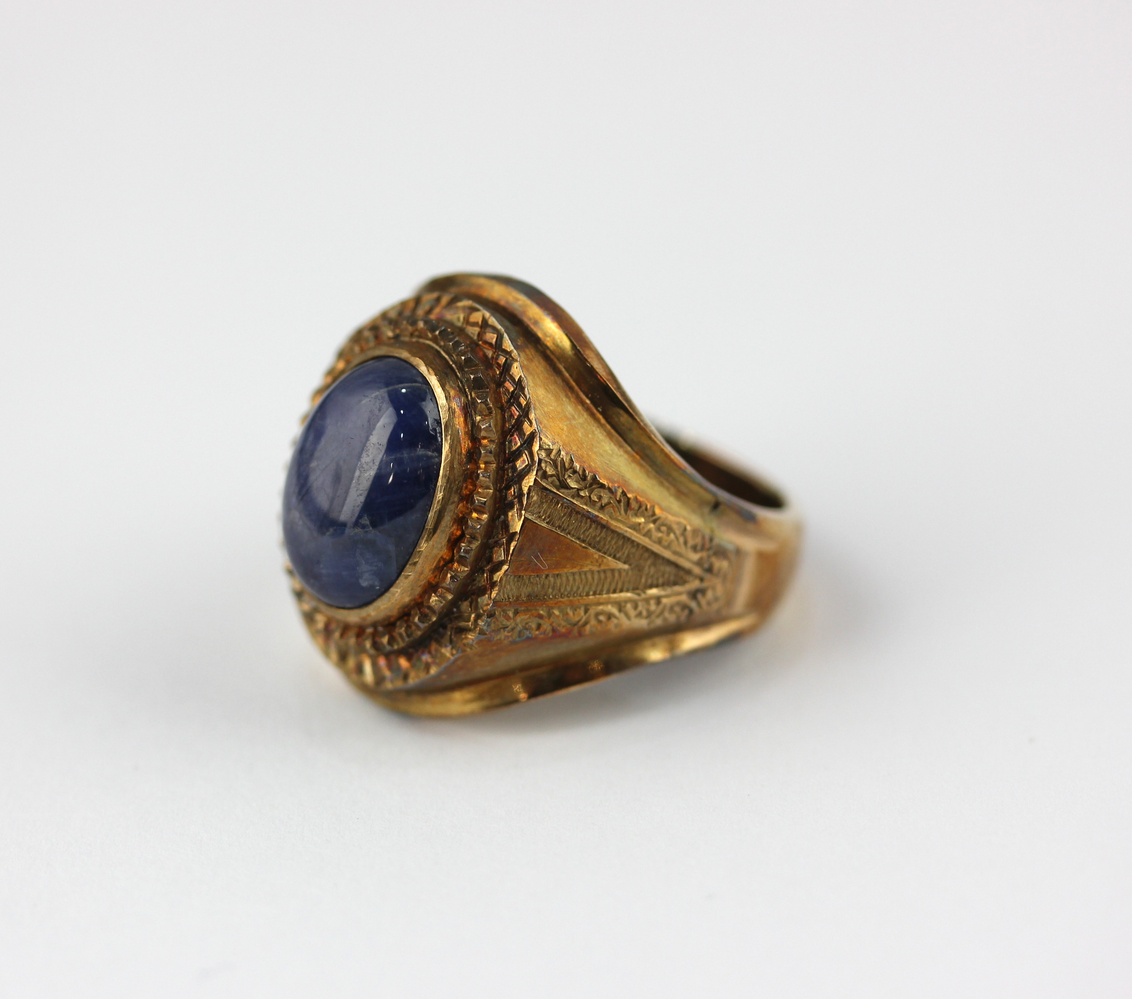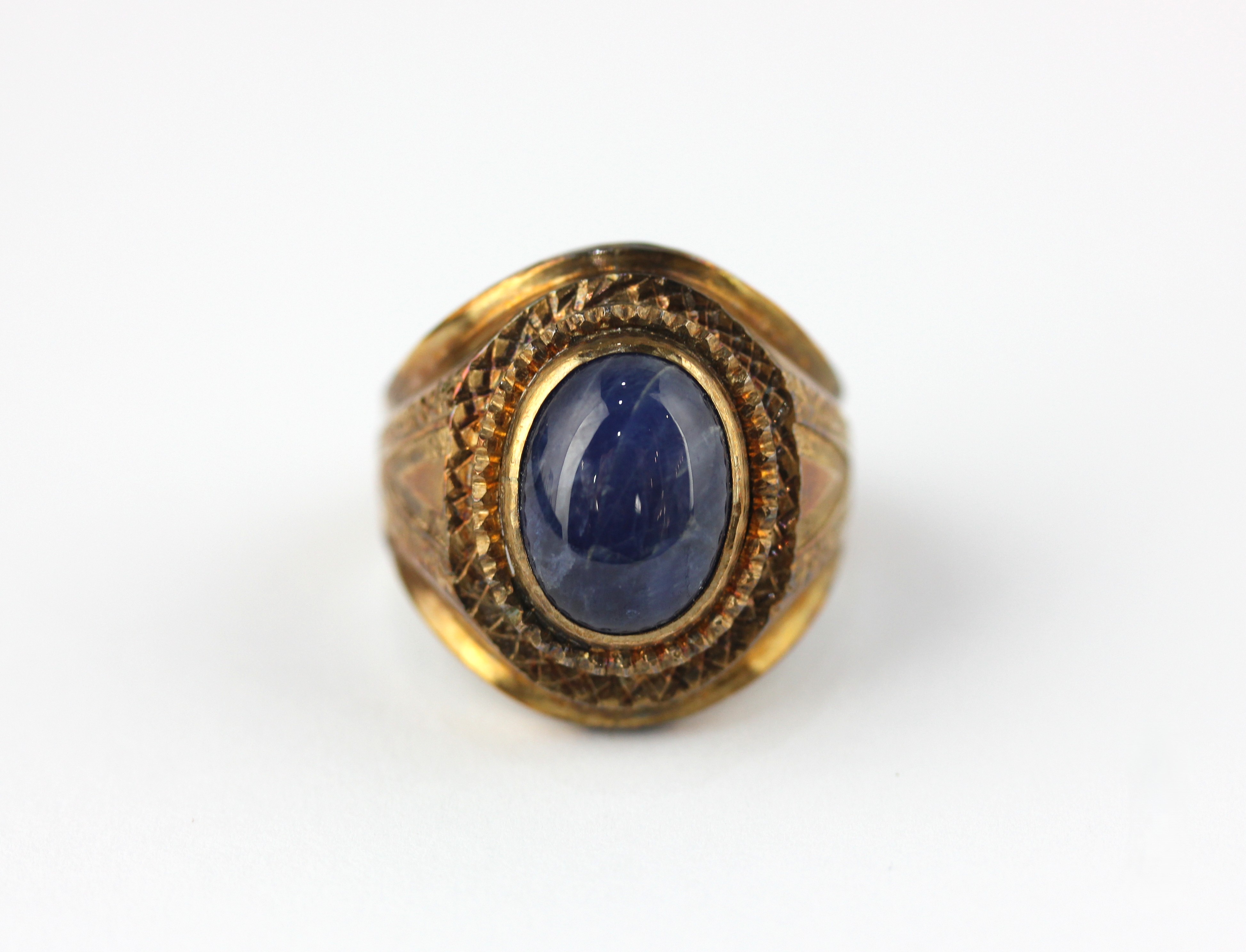 A large oval cabochon sapphire single stone ring set in unmarked yellow metal (a/f)