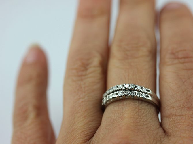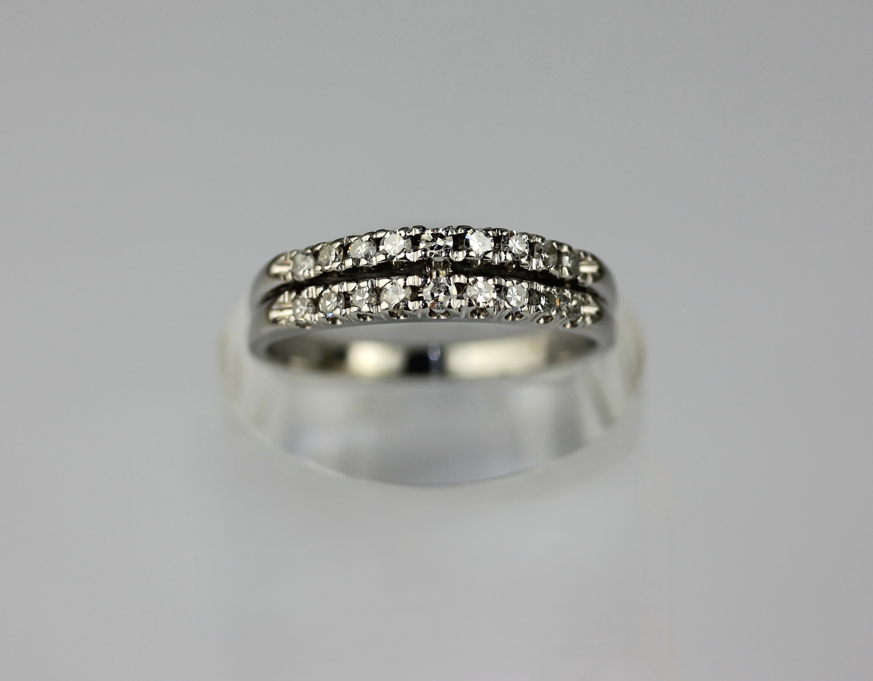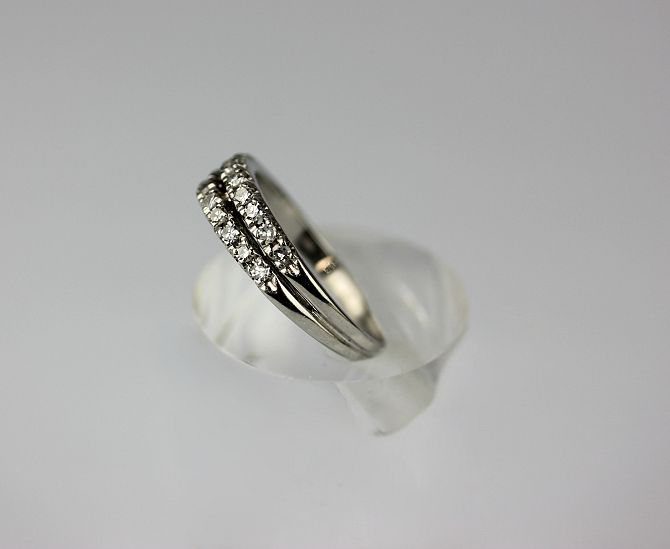A white gold and diamond ring claw set with two rows of diamonds, detailed '750', size R 1/2, gross weight 3.7g, with a case