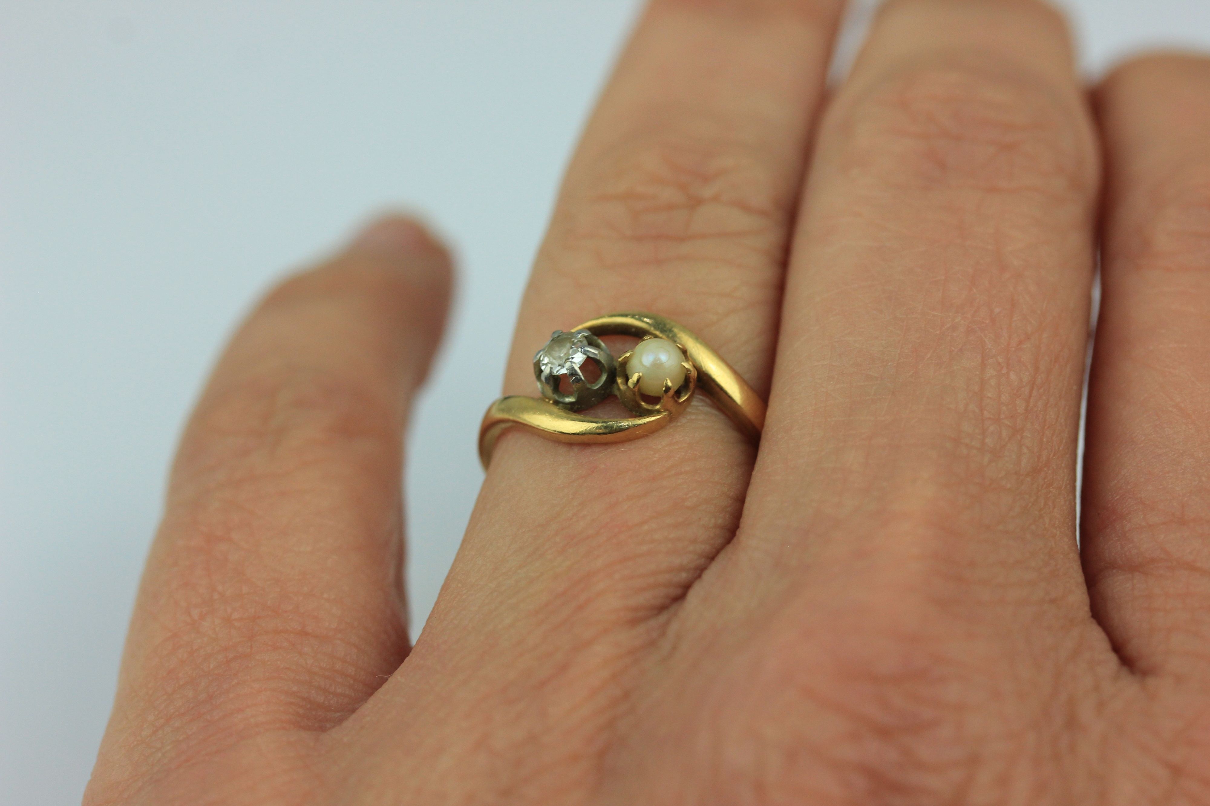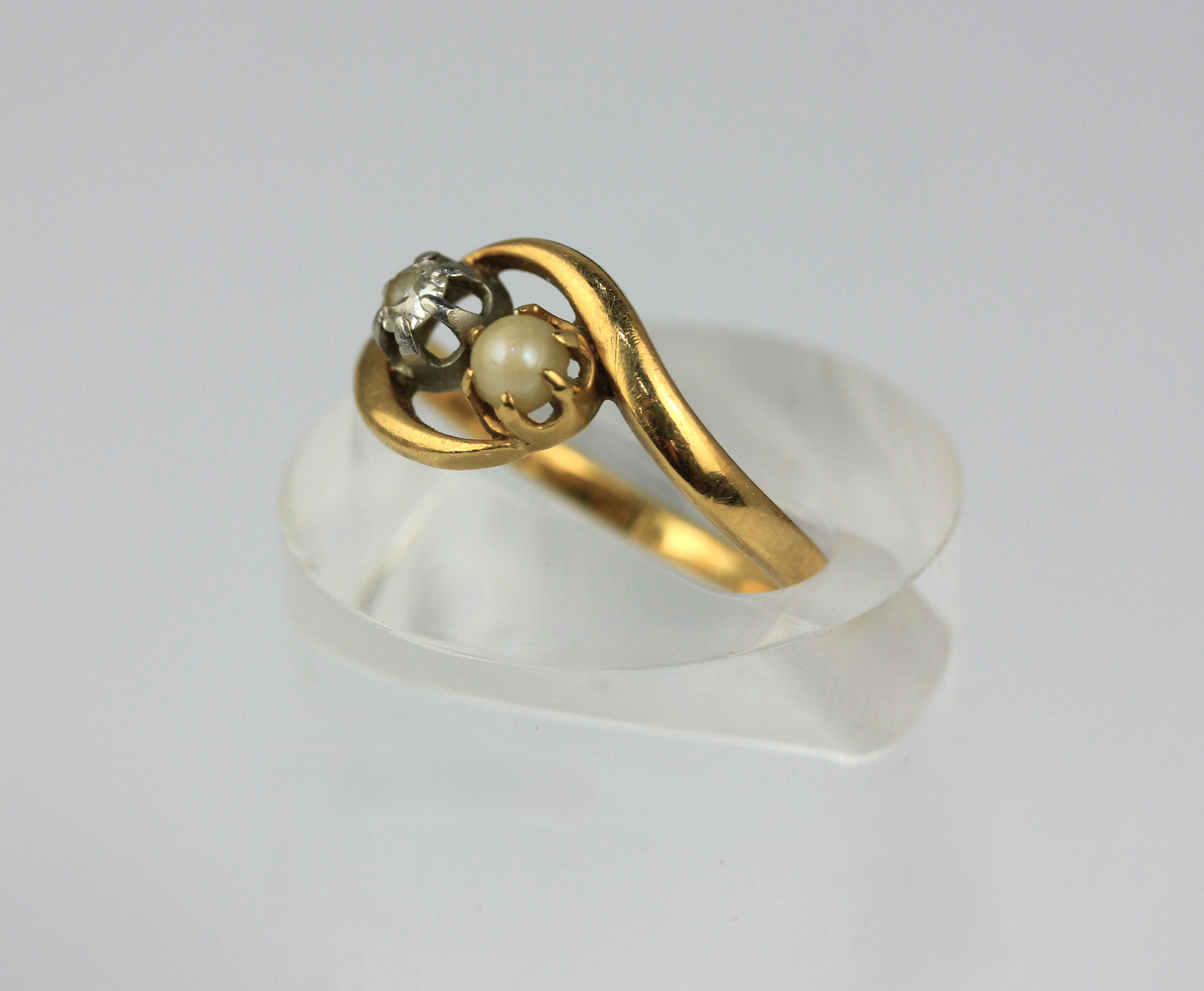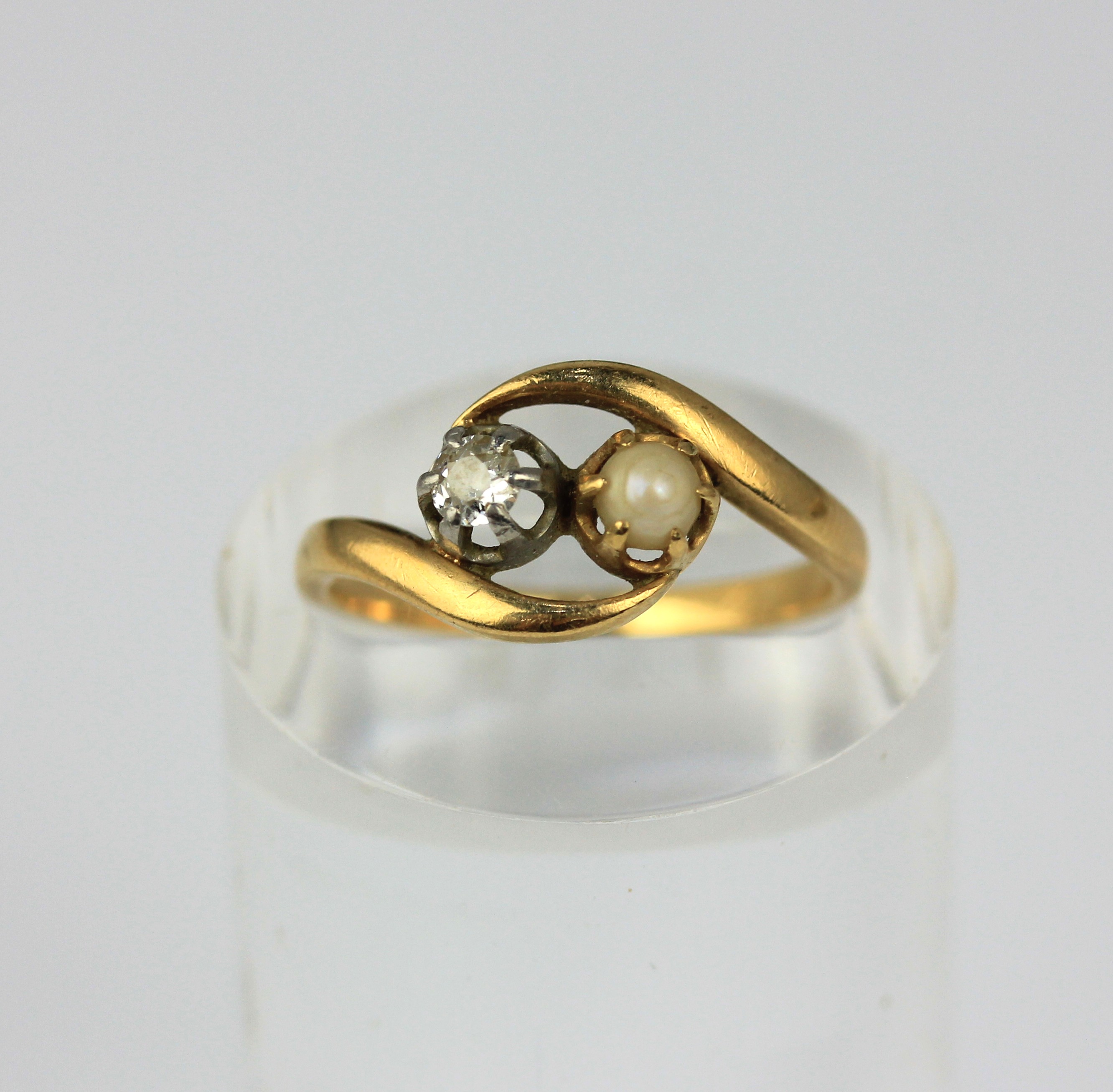 A French gold ring claw set with a cushion shaped diamond and with a single cultured pearl in a twistover design, ring size K 1/2, gross weight 2.5g