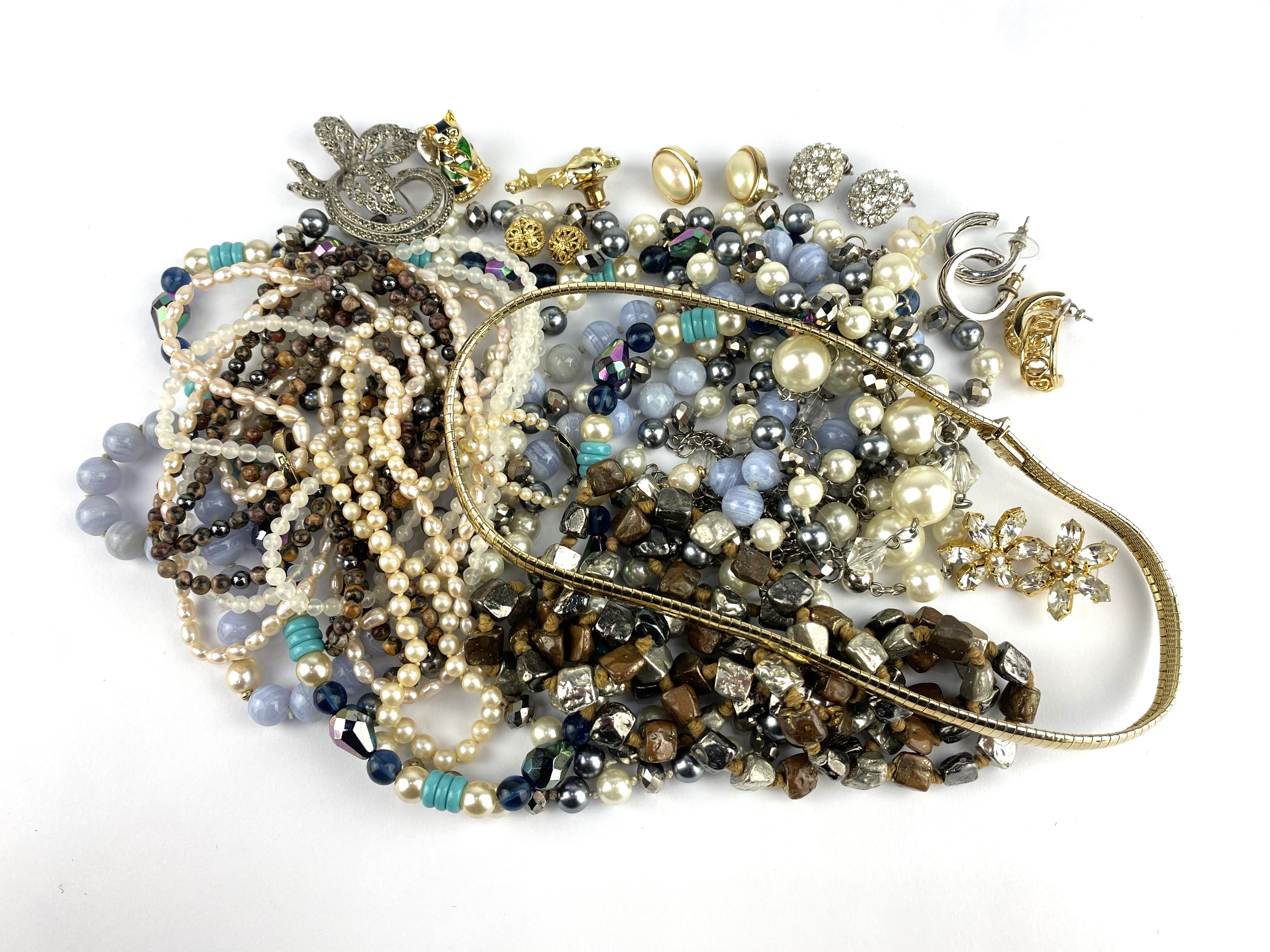 A group of mostly costume jewellery including a three row necklace with a 9ct gold oval clasp, a silver gilt necklace detailed 925 Italy and a pale blue stained agate bead necklace