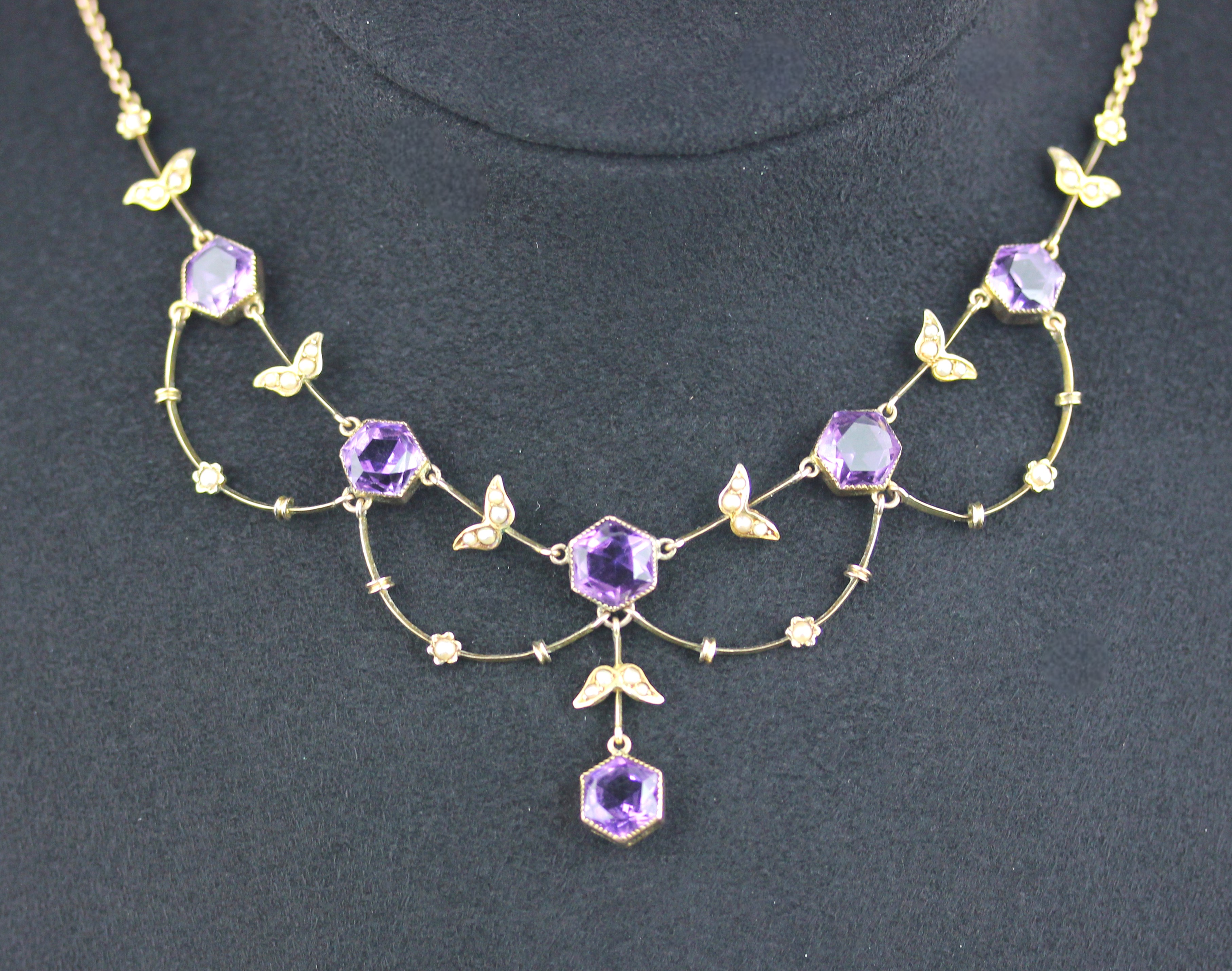 A gold amethyst and seed pearl necklace, c. 1910, mounted with six hexagonal cut amethysts, otherwise set with seed pearls with foliate motifs at intervals, on a cylindrical clasp, length 40cm, detailed 9ct, gross weight 9.1g, with a case