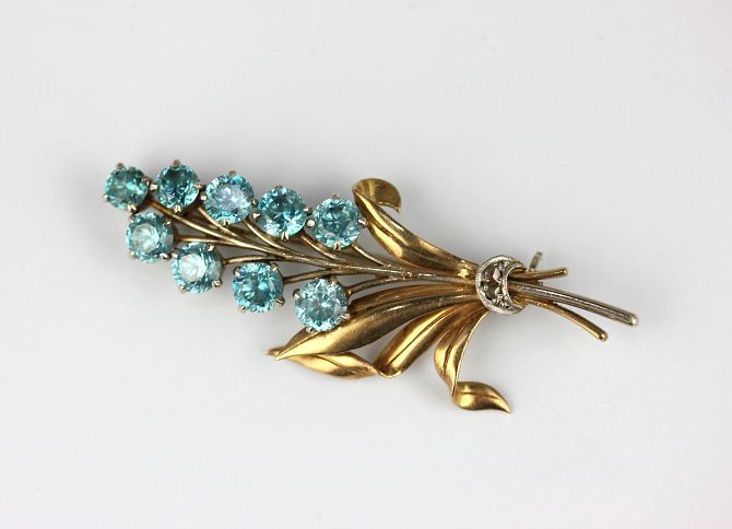 A gold, blue zircon and diamond brooch designed as a floral spray, numbered 7259, length 5.5cm, gross weight 7.8g, with a Garrard & Co Ltd case