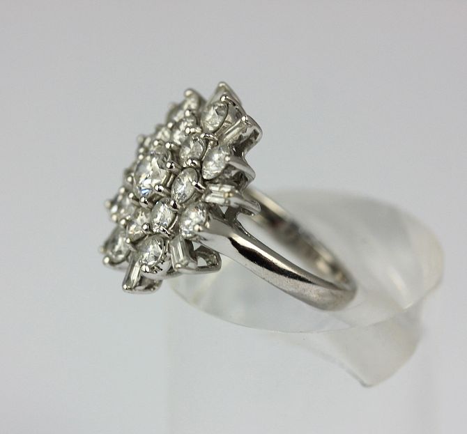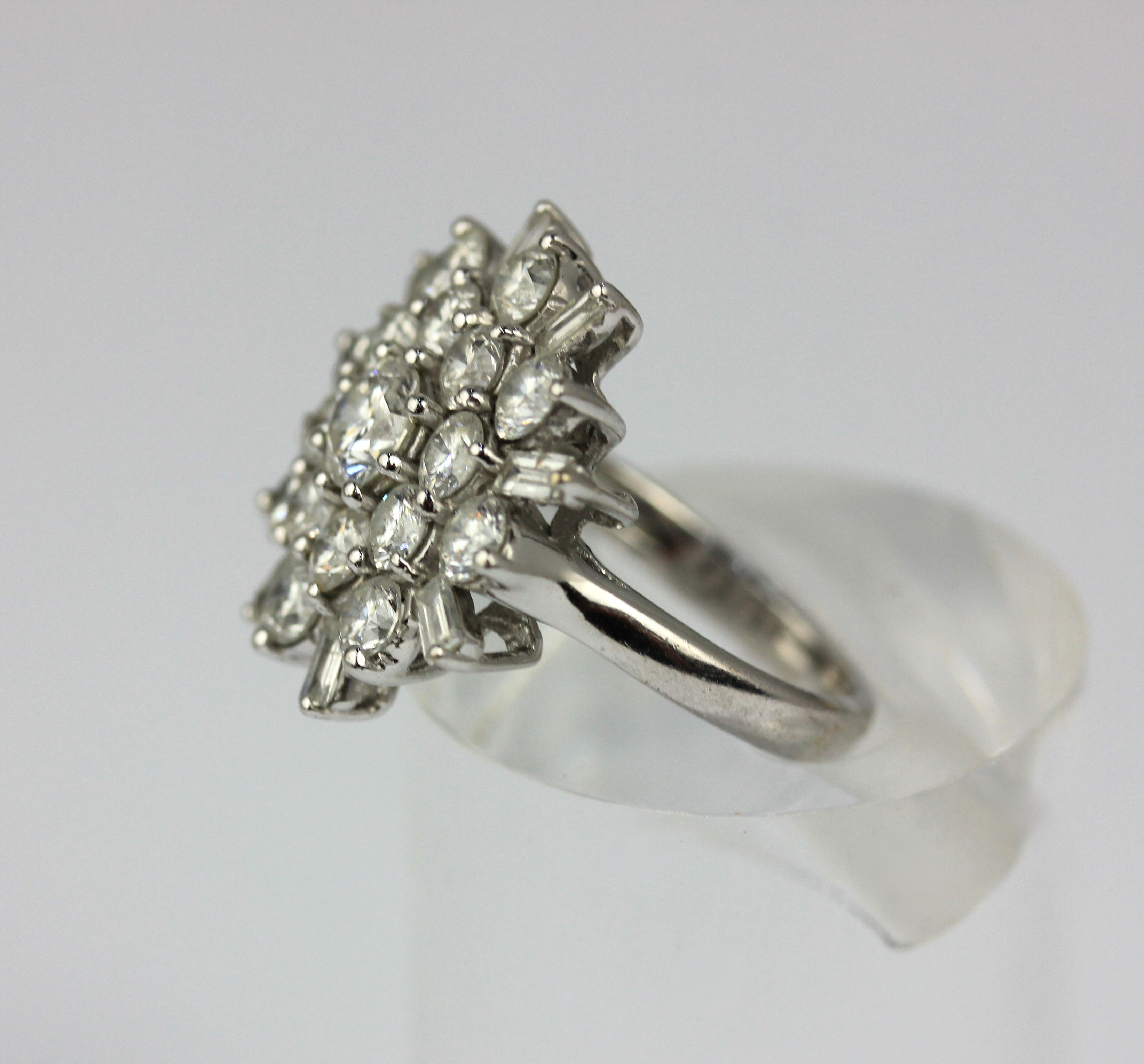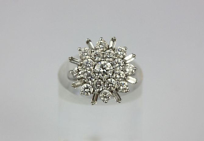 A diamond cluster ring claw set with circular cut diamonds and further set with eight baguette diamonds to the border, ring size L, gross weight 7.3g