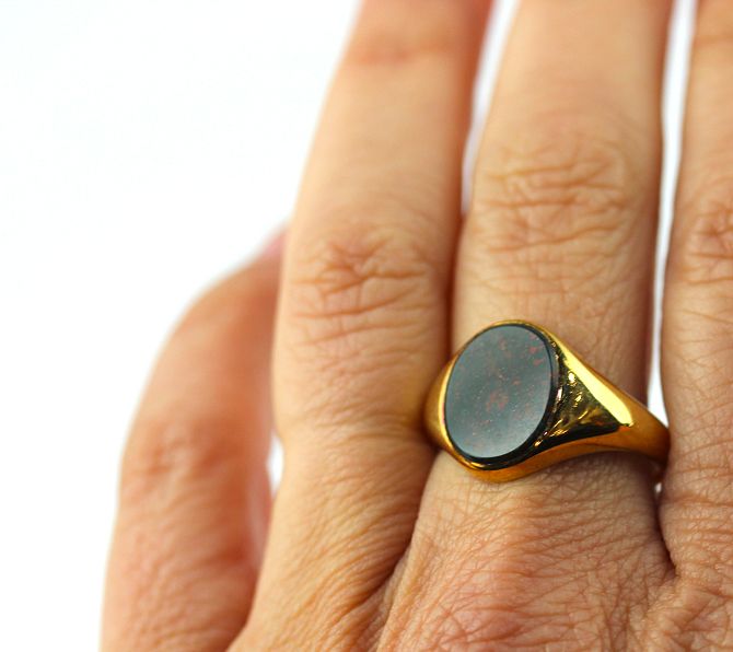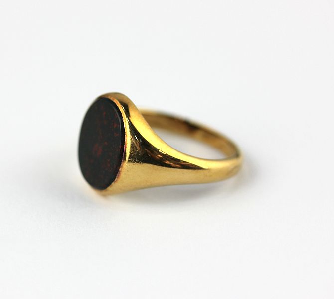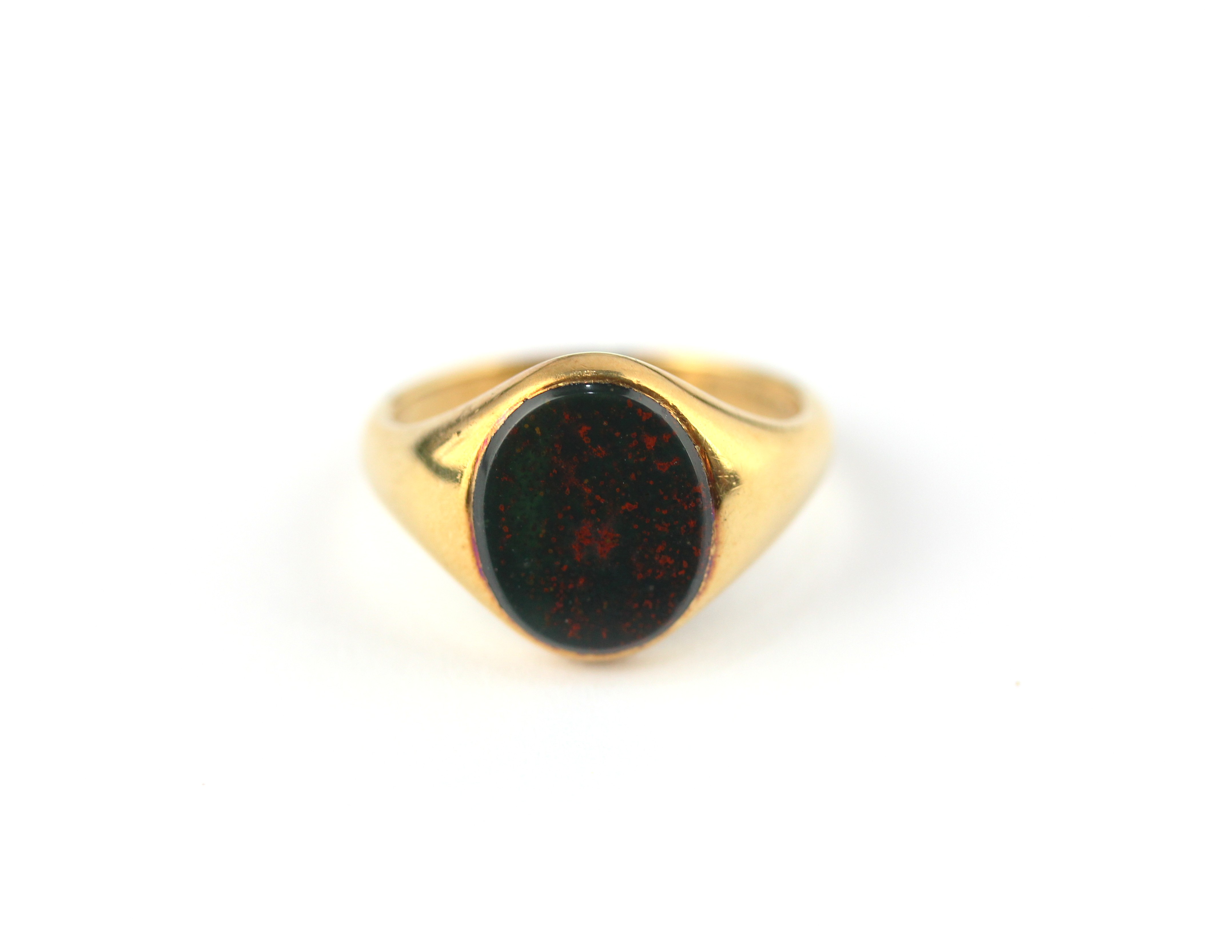 A gentleman's 18ct gold and bloodstone oval signet ring, ring size T, gross weight 8.9g