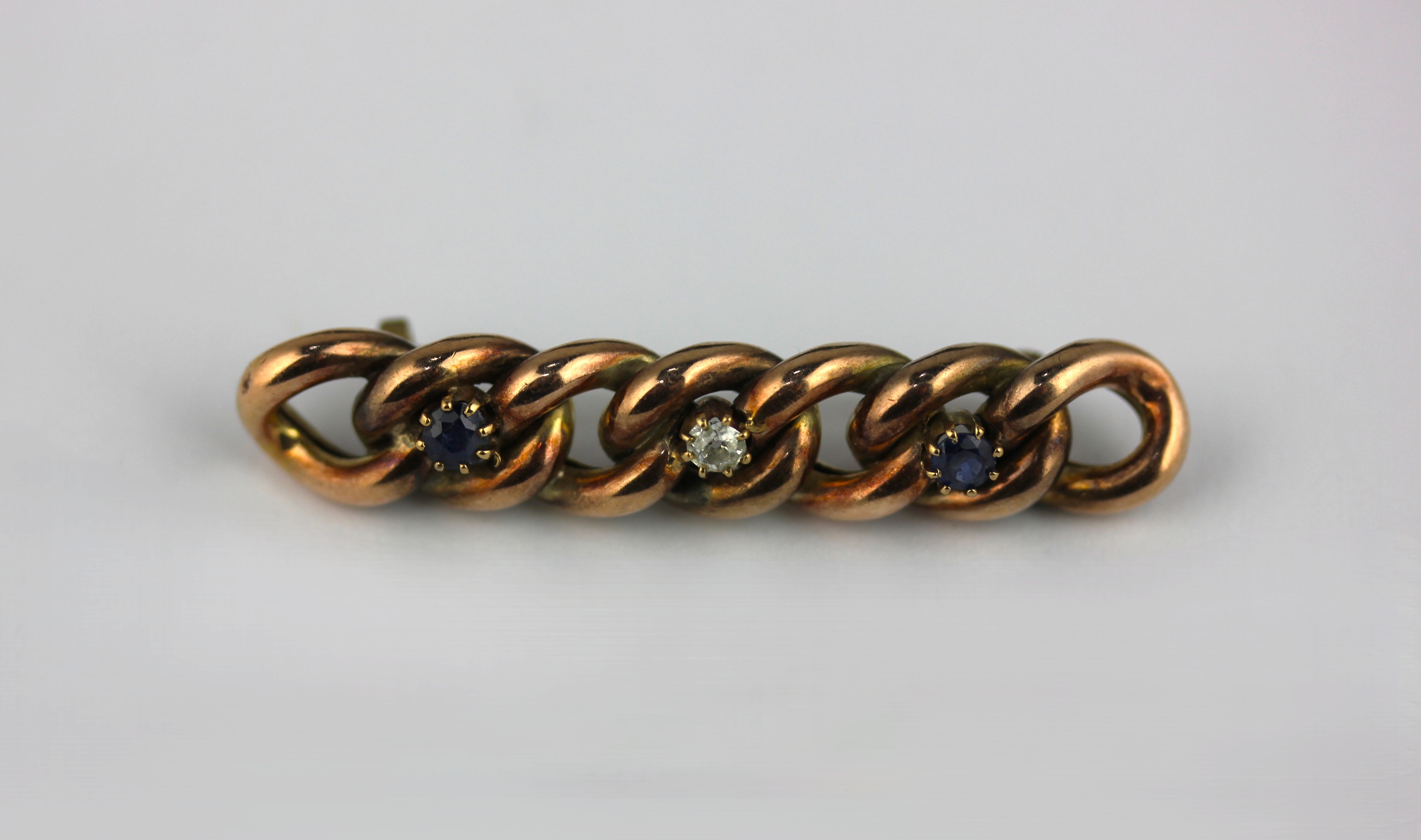 A gold, sapphire and diamond three stone brooch, in a curb chain link design, claw set with a cushion shaped diamond between two sapphires, detailed 9c, length 4cm, gross weight 4.2g
