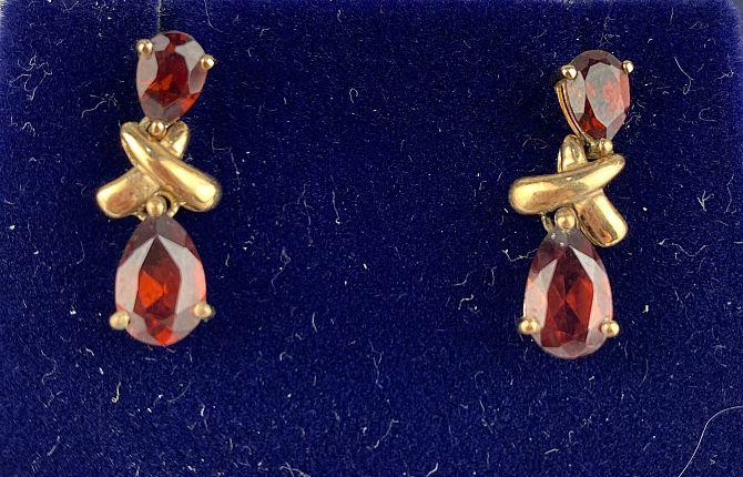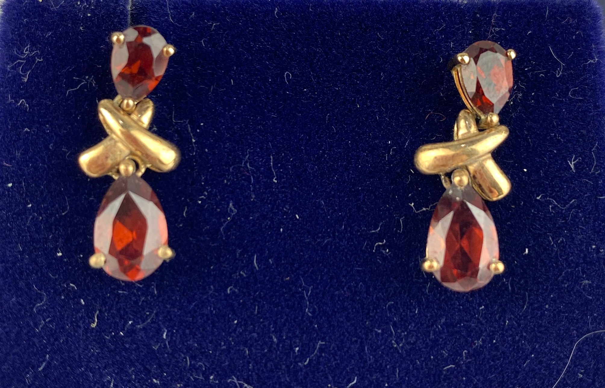 A pair of gold and garnet two stone ear studs having post and butterfly fittings detailed 9ct, gross weight 2.4g