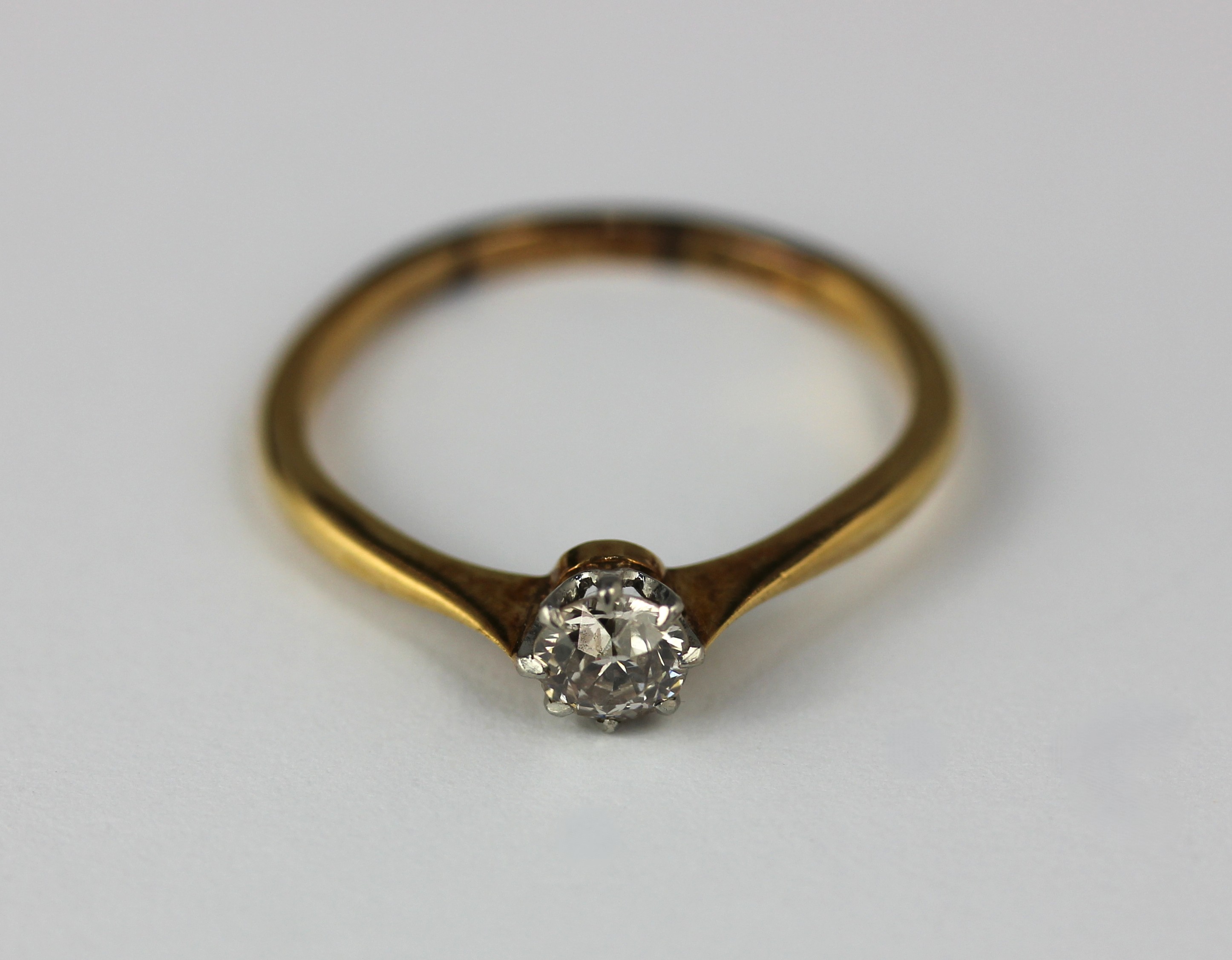 A gold and diamond single stone ring claw set with a cushion shaped diamond, detailed '750', ring size R, gross weight 2.8g