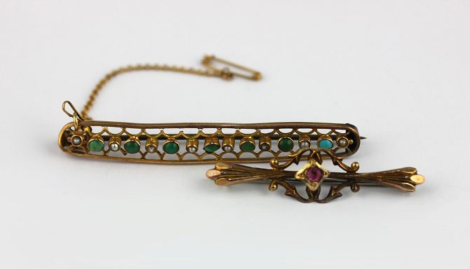 Two brooches comprising a gold seed pearl and turquoise bar brooch , unmarked, length 6cm, and a smaller 9ct gold bar brooch Chester 1915, gross weight 5.6g