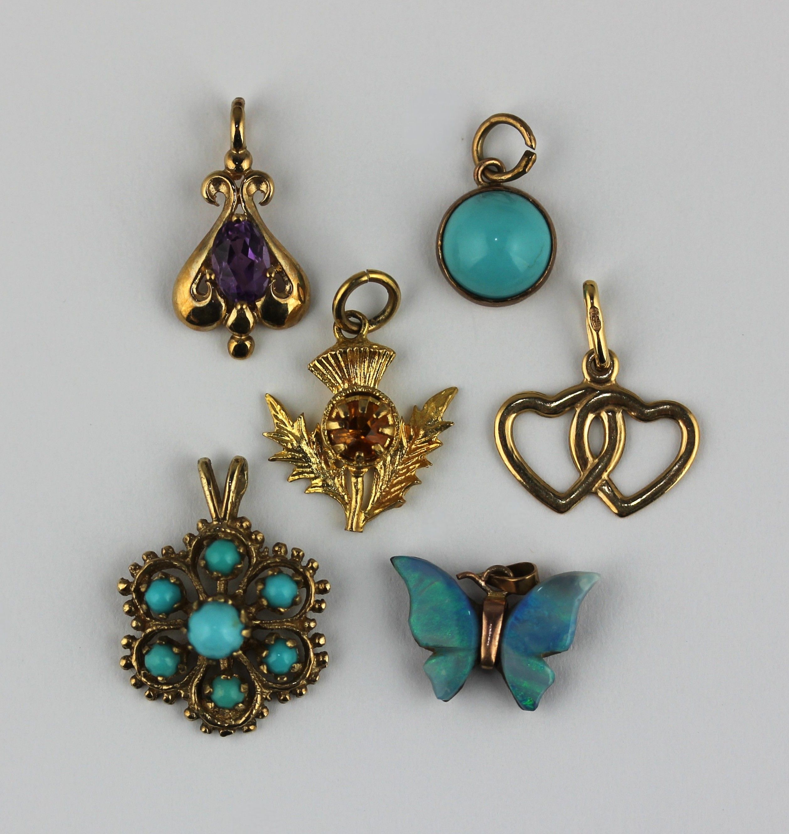 A group of six pendants, to include a 9ct gold and turquoise cluster pendant, a 9ct pendant designed as a thistle, a 9ct gold and amethyst pendant, an oval butterfly pendant, and two further pendants, combined gross weight 5.1g