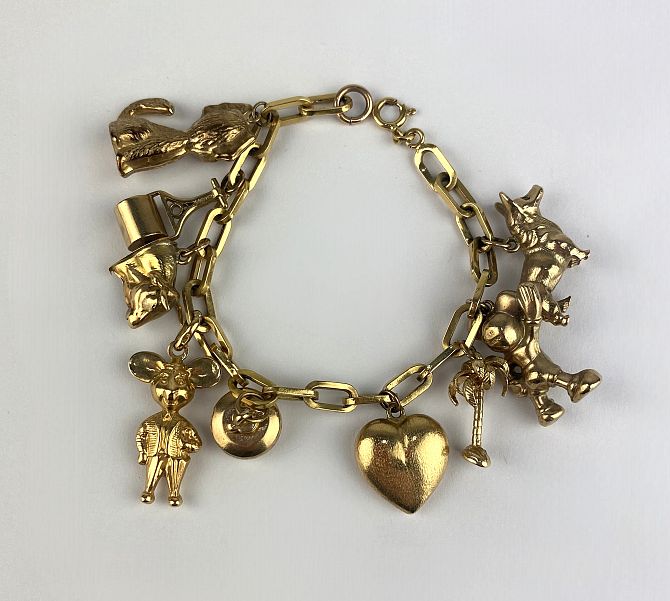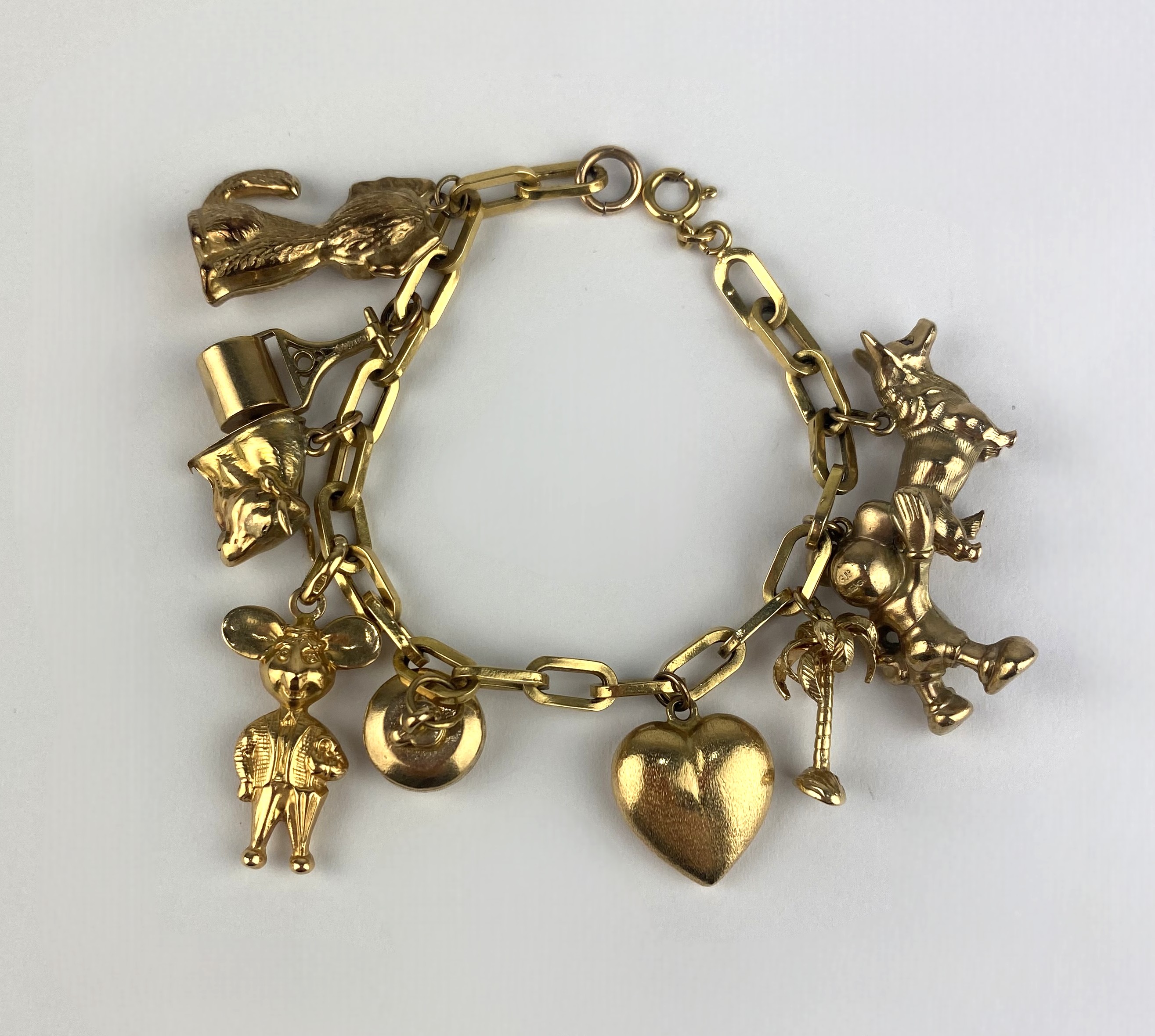 A 9ct gold bar link charm bracelet fitted with nine charms including a 9ct gold corgi, 9ct Mickey Mouse, and a 9ct gold loose teapot charm, gross weight 33.8g