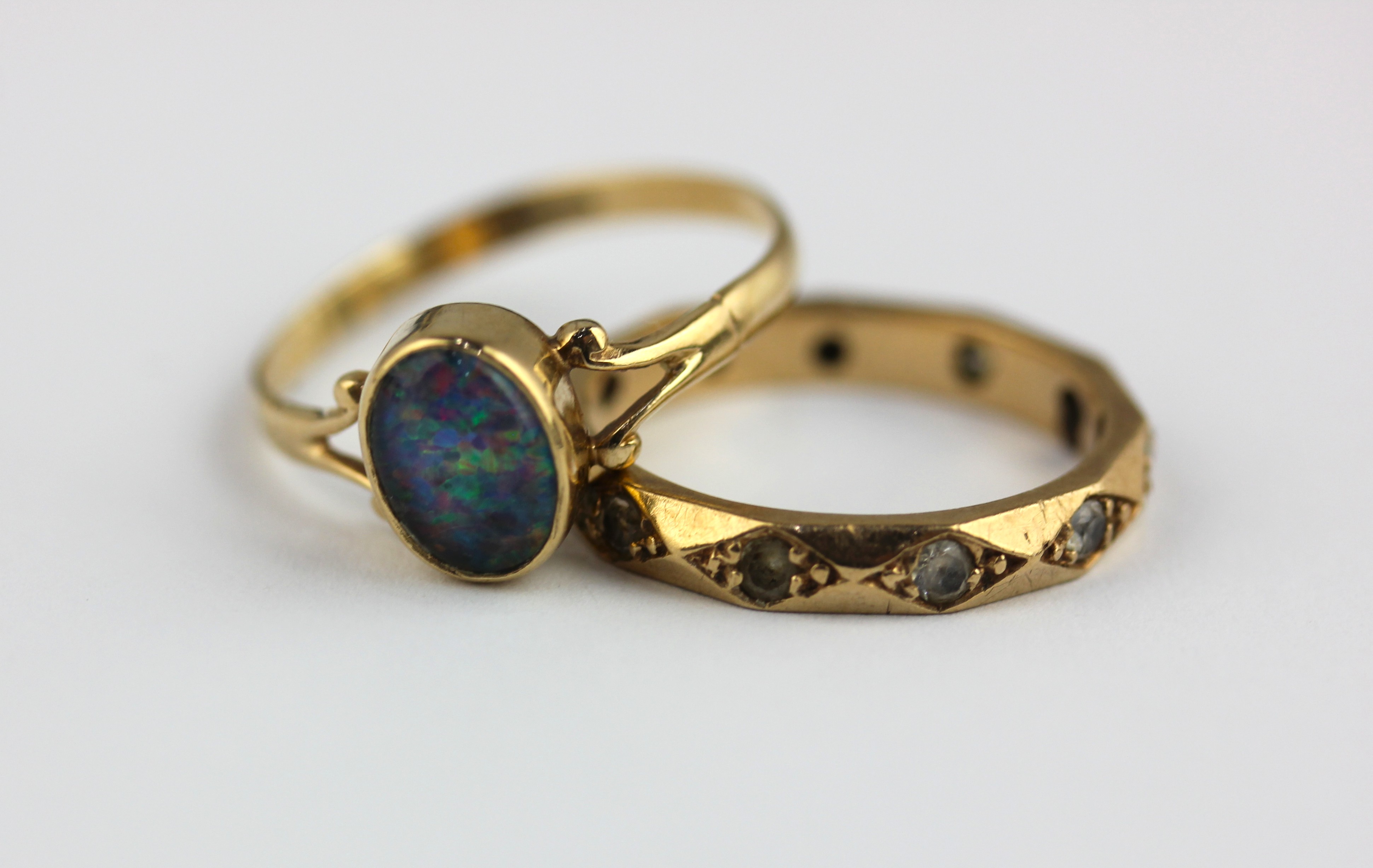 A 9ct gold and opal doublet solitaire ring and a 9ct gold and colourless gem set eternity ring, the opal doublet ring size Q, the eternity ring size M, combined gross weight 3.8g