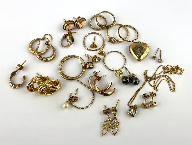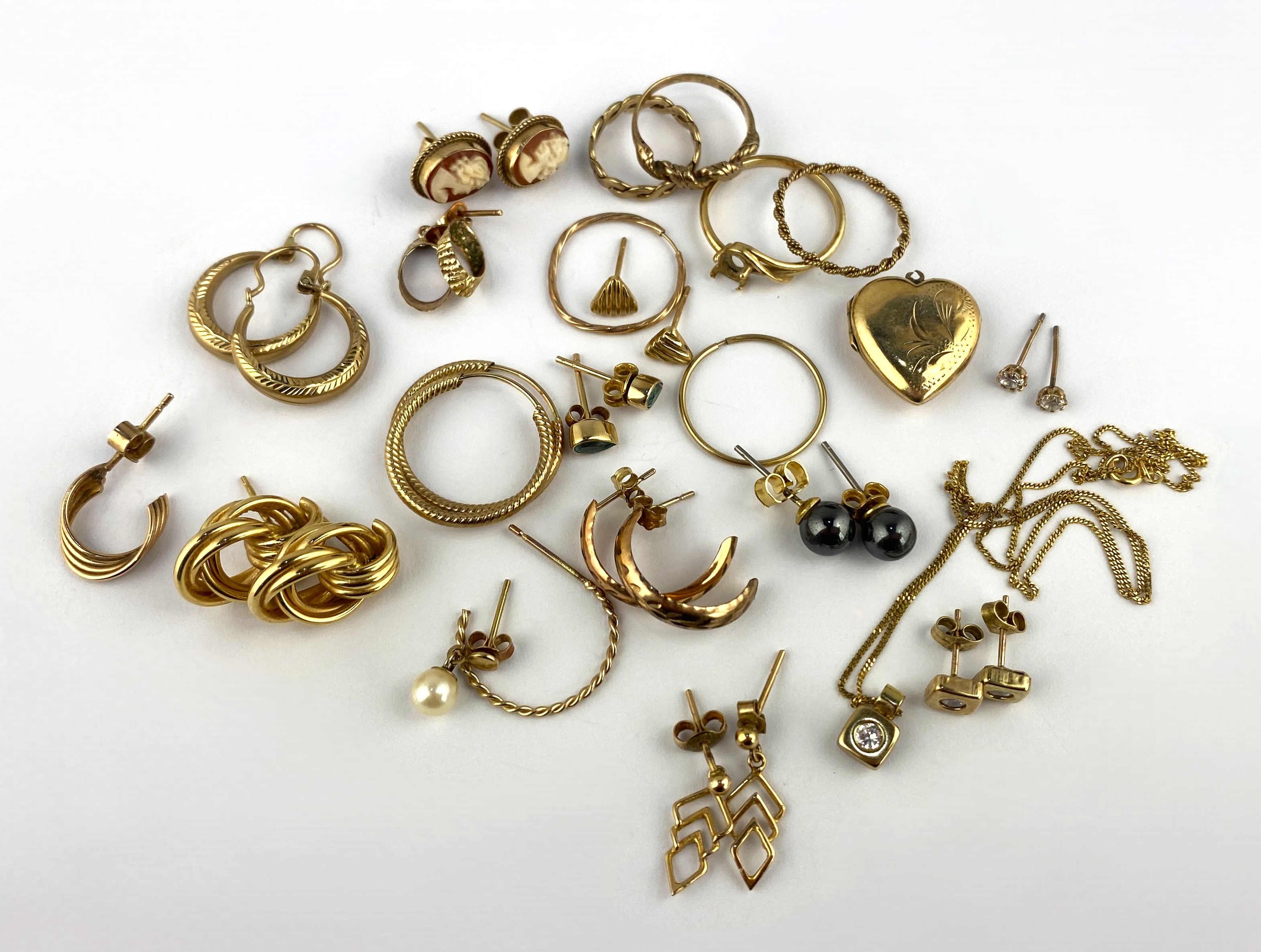 A group of gold and further jewellery, comprising a pair of 18ct gold ear studs in a woven design, weight 3g; a gold ring mount, detailed 585, the stone lacking, weight 1.5g; ten further pairs of ear studs, a pair of 9ct gold and shell cameo ear studs, three further rings, a 9ct gold heart shaped locket, a colourless gem pendant with a gold neck chain and five odd earrings, combined gross weight excluding one pair of black bead ear studs 15g