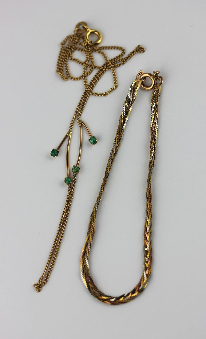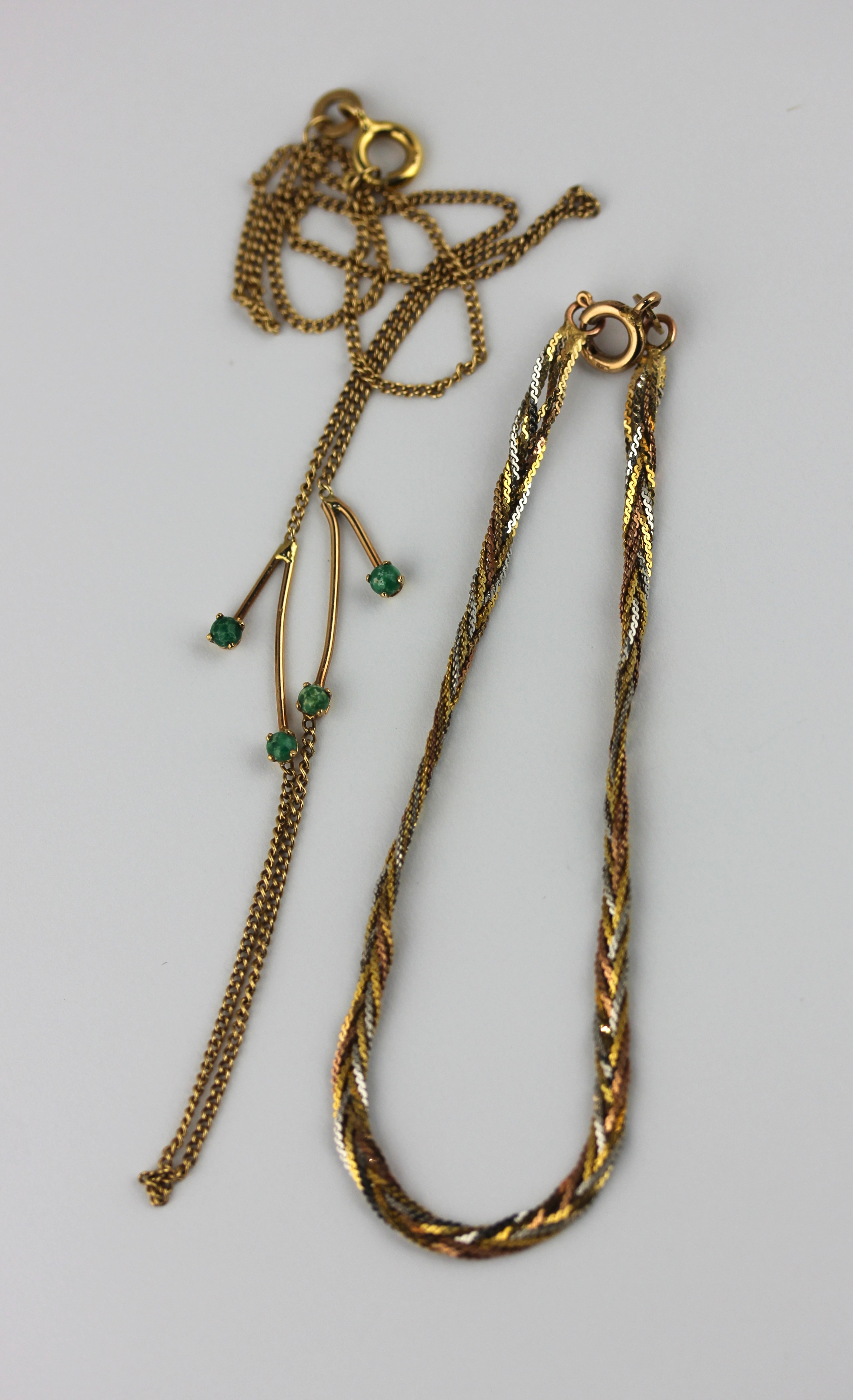 A gold bracelet and a gold necklace, the 9ct three colour gold bracelet in a multiple strand design, and a gold and turquoise necklace, combined gross weight 4.6g