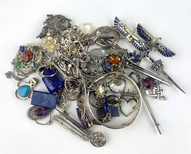 A group of silver and costume jewellery, including brooches, rings, pendants, a filigree bangle and further items, some of Egyptian design
