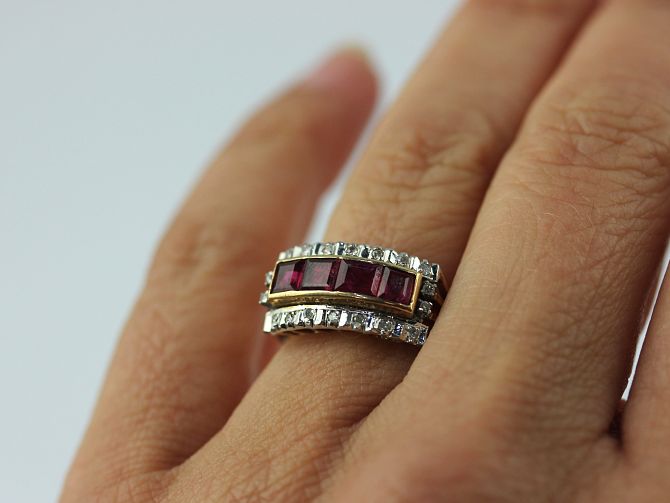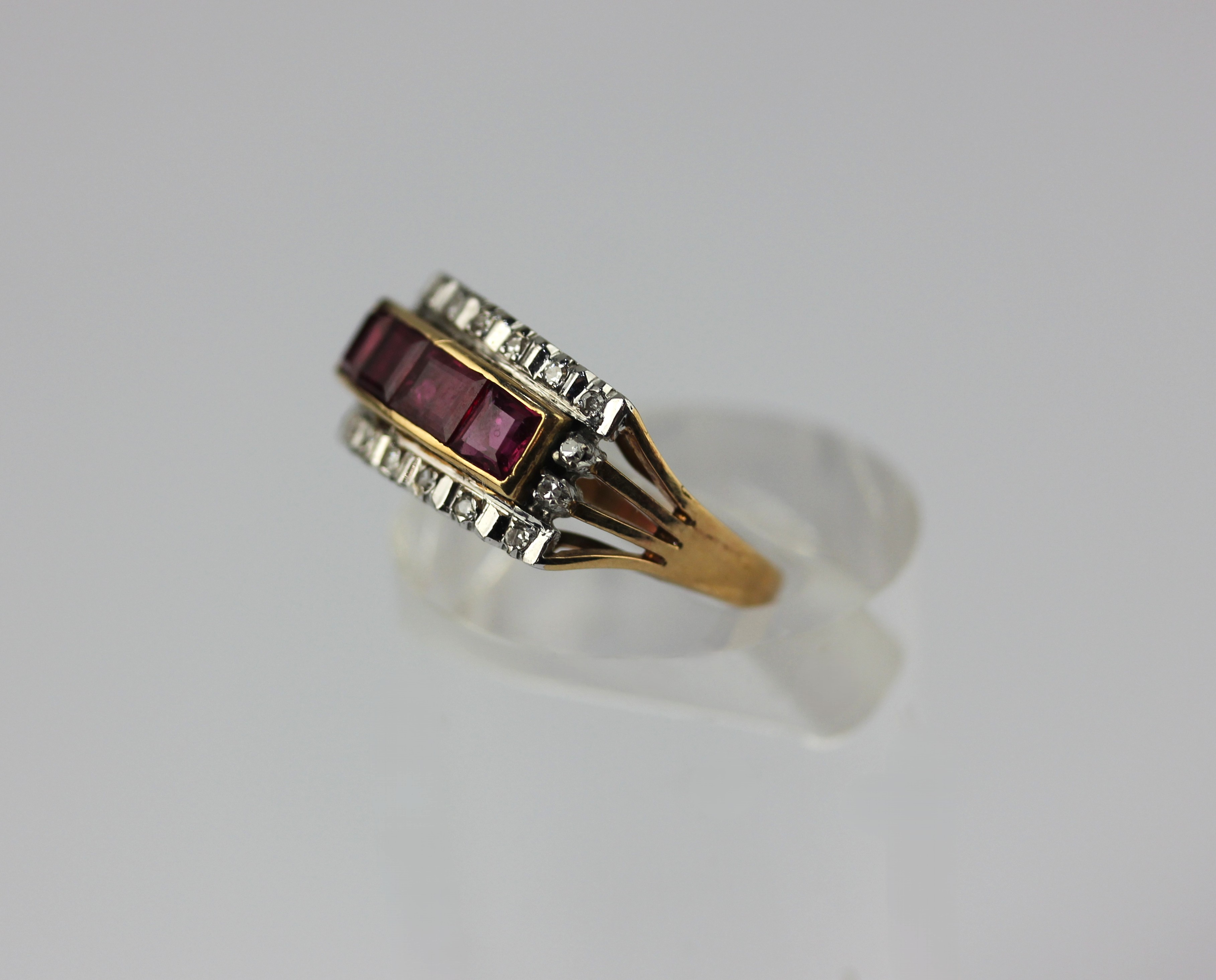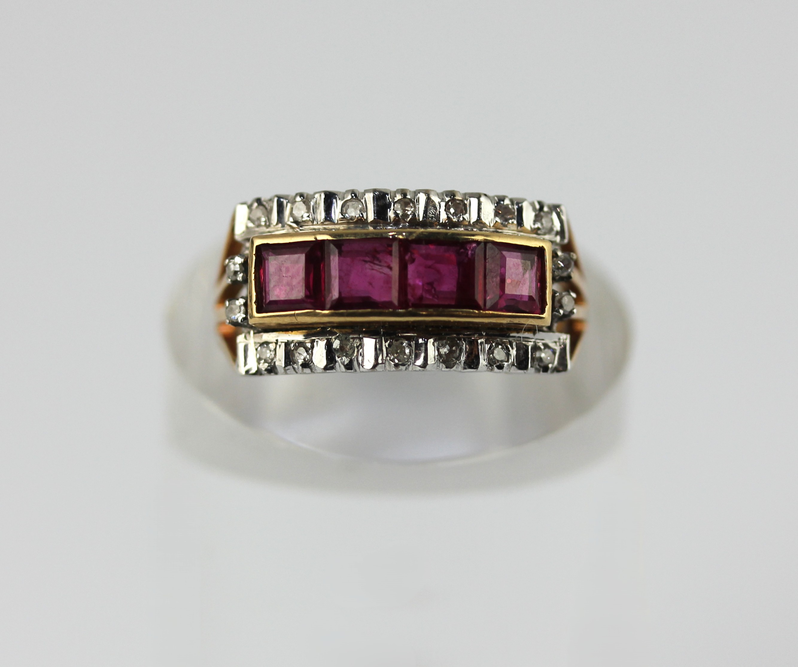 A gold ring mounted with a row of four rectangular cut rubies between diamond set sides, detailed '18k', ring size L, gross weight 4.1g