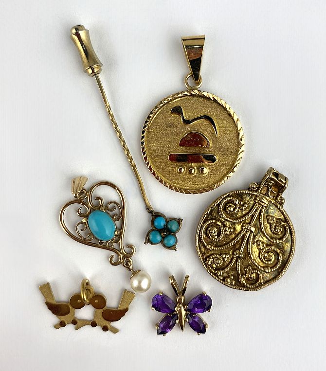 A group of five pendants and a stick pin, to include a 9ct gold turquoise and cultured pearl pendant, a 9ct gold and amethyst butterfly pendant, a 9ct gold pendant designed as two birds, combined gross weight 3g; two further pendants and a turquoise stick pin