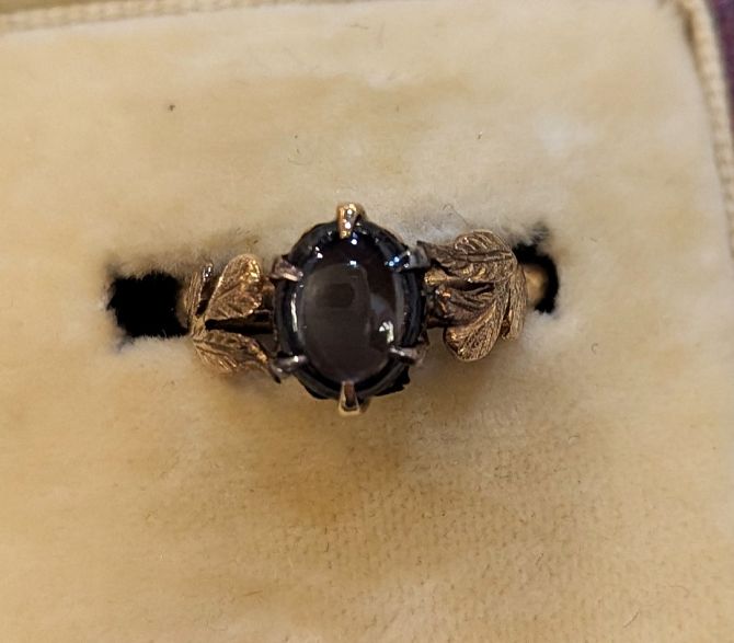 A gold and cabochon black sapphire soliatire ring having foliate shoulders, size M, gross weight 2.3g, with a case